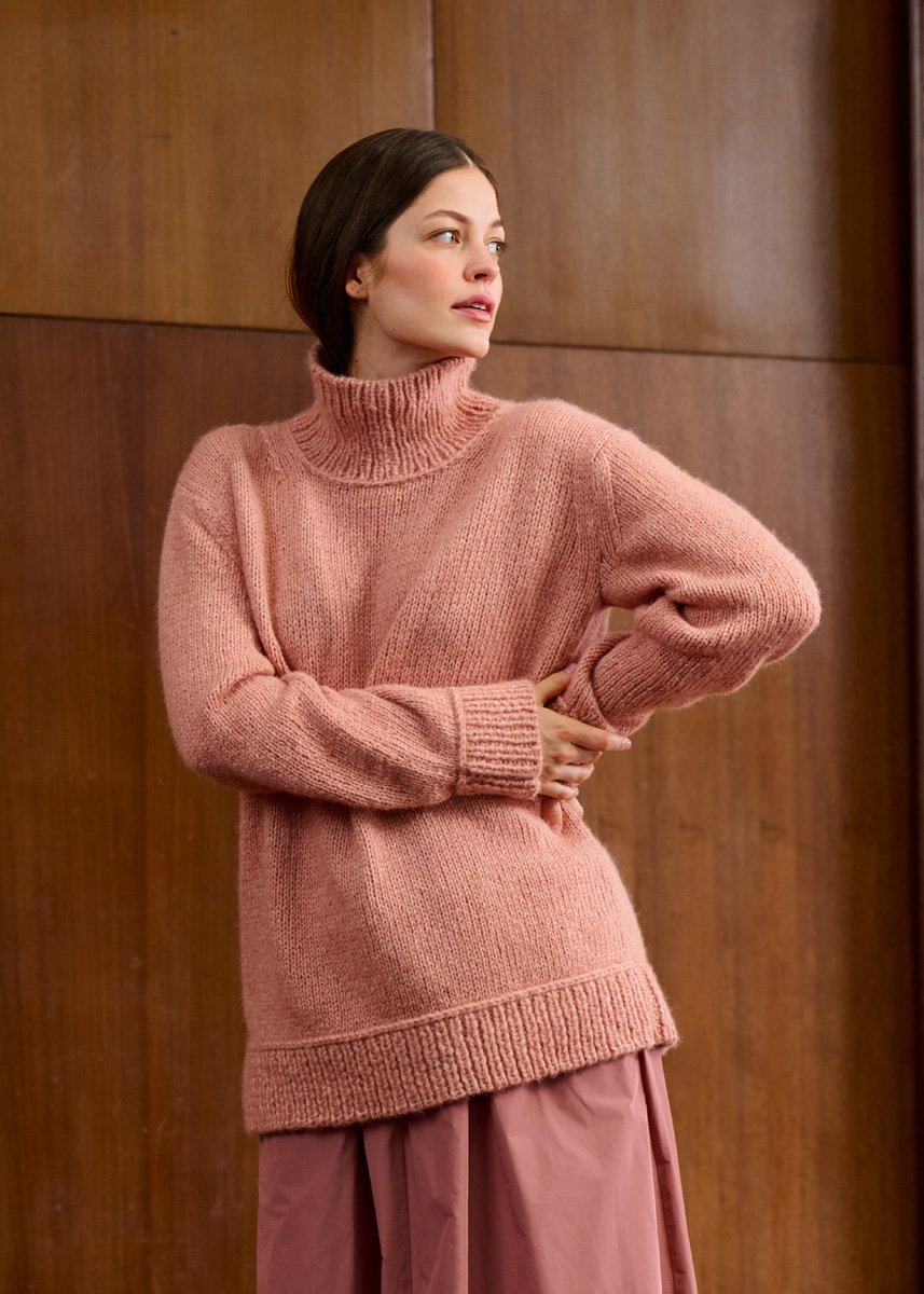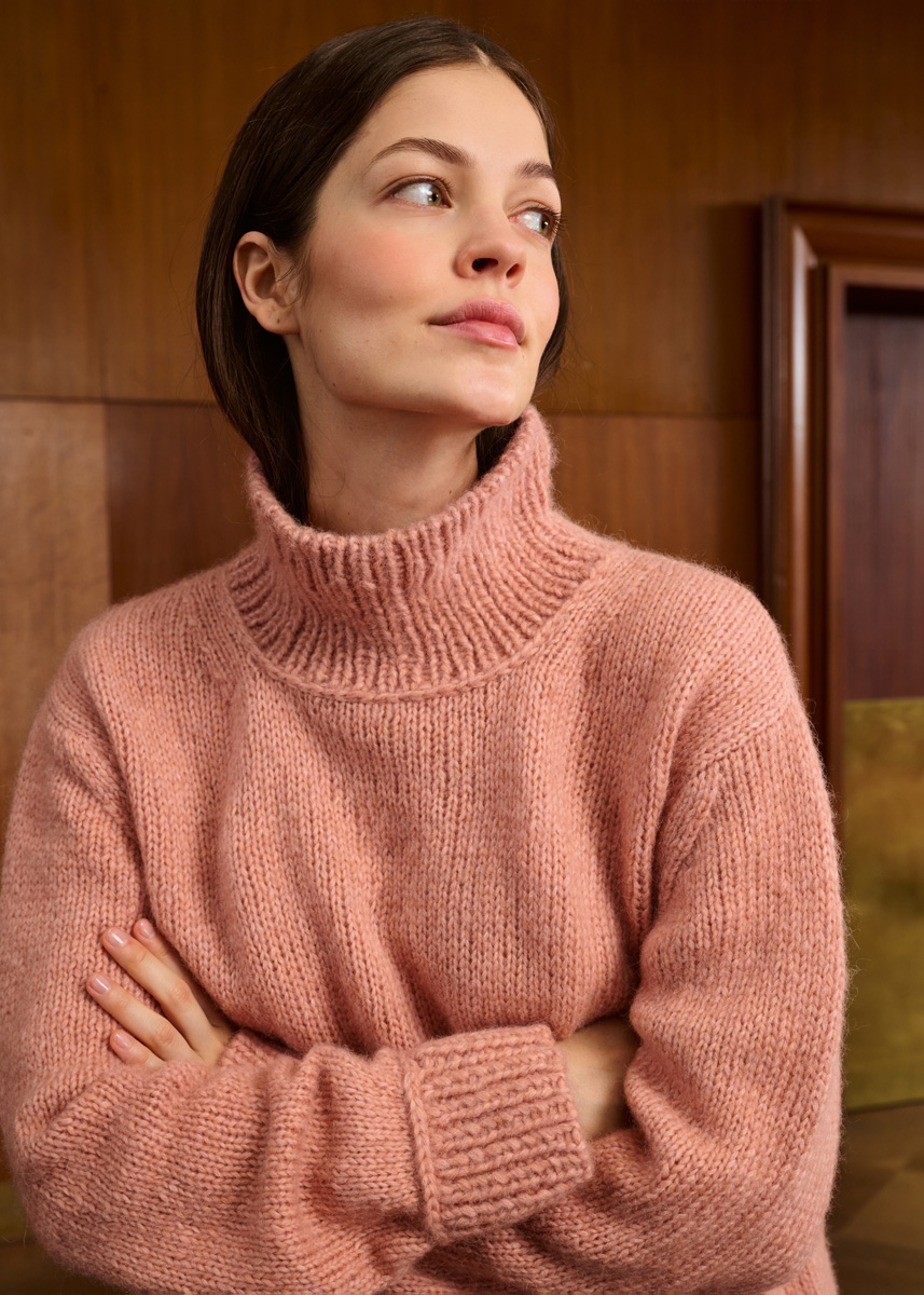 Lana Grossa Brigitte No. 2 (47% Alpaka (Baby), 45% Baumwolle, 8% Schurwolle (Merino), Lauflänge 140 m/50 g), 500 (550 – 600) g Pfirsich (Fb. 55); Stricknadeln Nr. 6 und 6,5, sowie 1 Nadelspiel Nr. 6 und 6,5.