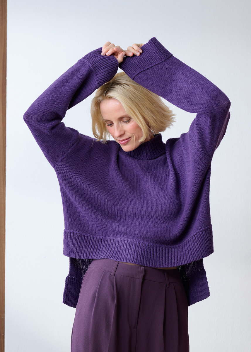 Lana Grossa Cashmere Pure (100% Kaschmir, Lauflänge 115 m/25 g), 375 (400 – 425 – 450) g Aubergine (Fb. 23); Stricknadeln Nr. 3,5 und 4, sowie je 1 Nadelspiel Nr. 3,5 und 4.