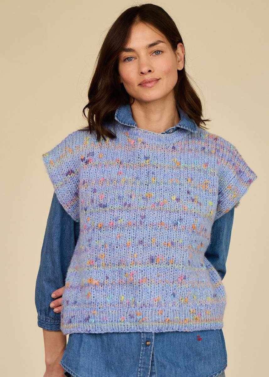 Lana Grossa-Qualität „Cassata“ (54 % Schurwolle (Merino extrafine), 30 % Polyamid, 16 % Baumwolle, LL = ca 175 m/50 g): ca 150 (200 - 200 - 250) g Hellblau/Pink/Gelb/ Orange/Blaulila (Fb 5); Stricknadeln Nr 4,5 und 5; 1 kurze Rundstricknadel Nr 4,5.