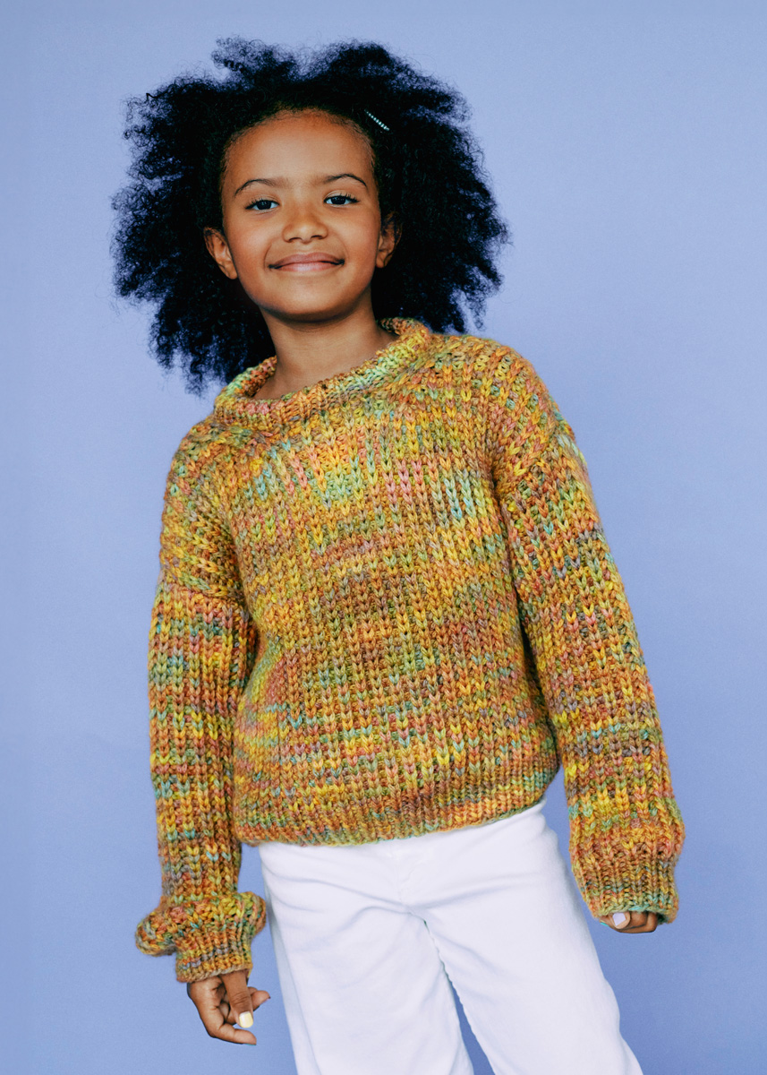Lana Grossa Cool Merino Big Color (90% Schurwolle (Merino), 10% Polyamid, Lauflänge 90 m/50 g),300 (350 – 400) g Goldgelb/Ocker/Lindgrün/ Lachs/Khaki (Fb. 403); Stricknadeln Nr. 6 und 6,5, sowie 1 Rundstricknadel Nr. 6, 40 cm lang.