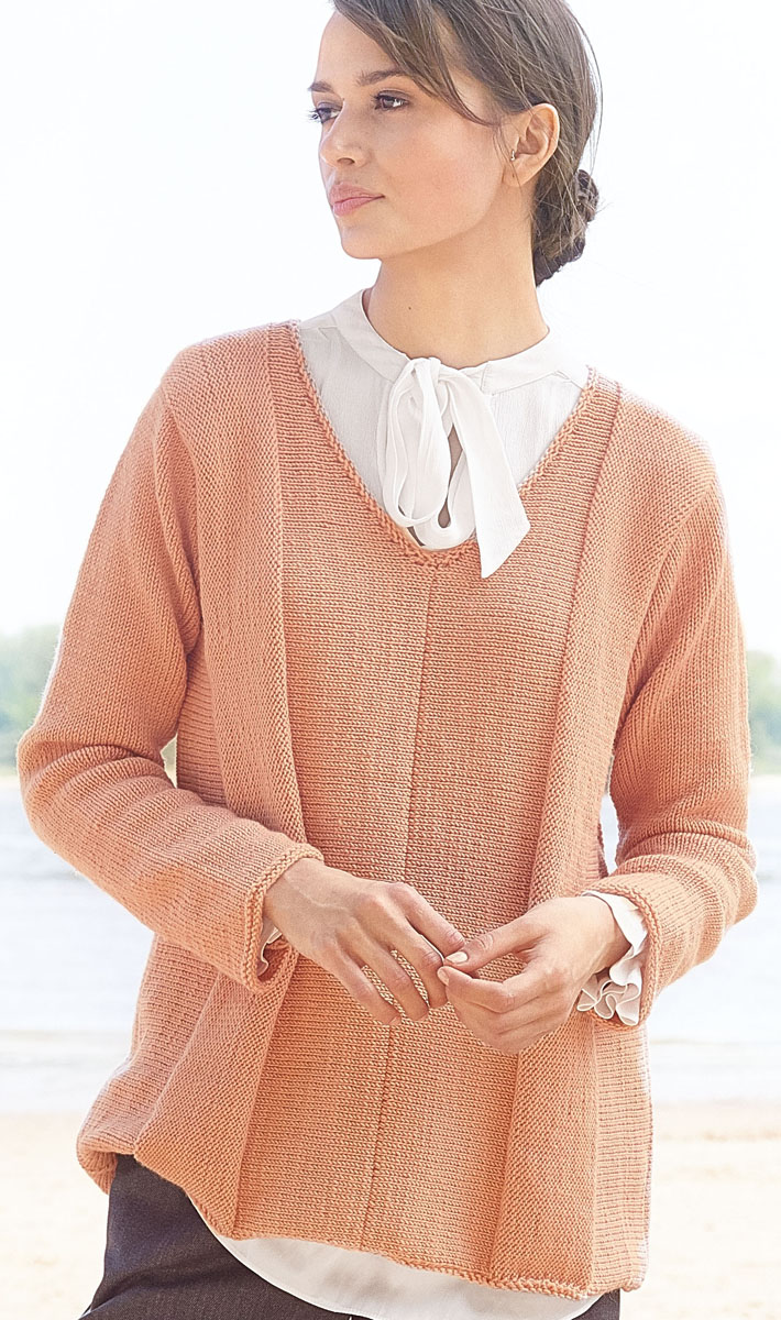 Der Trick bei diesem Streifenpulli ist: ein Ärmel plus Vorder- und Rückenteil werden jeweils bis zur Mitte in einem Stück gestrickt. Die lockere A-Linie entsteht