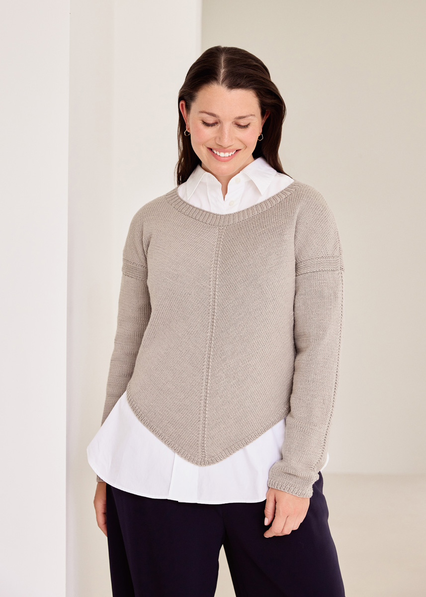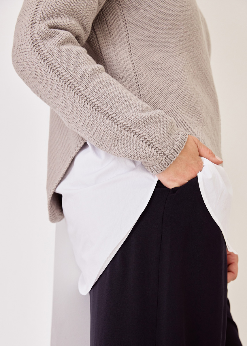 Lana Grossa Cool Wool (100% Schurwolle (Merino extrafein), Lauflänge 160 m/50 g), 450 (500 – 550 – 600) g Grège (Fb. 2027); Stricknadeln Nr. 3,5 und 1 Rundstricknadel Nr. 3,5, 40 cm lang.