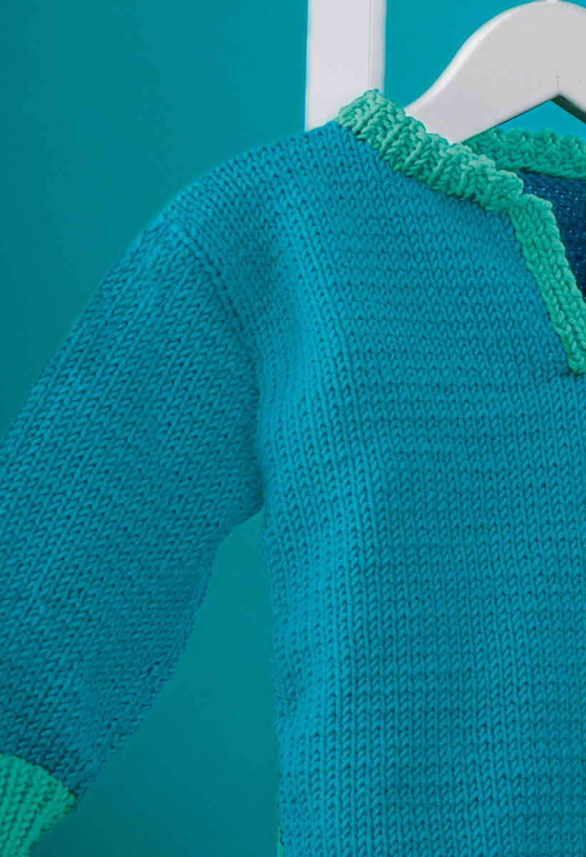 Lana Grossa Qualität Cool Wool, 100 % Schurwolle, Lauflänge 160 m/50 g; 150 g Türkis (Fb 502) und 50 g helles Smaragd (Fb 593); Stricknadeln Nr. 3,5, eine kurze Rundstricknadel Nr. 3,5, 2 Knöpfe.