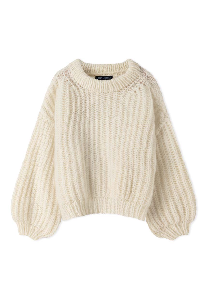 Merinowolle, locker verzwirnt mit einer Mischung aus Mohair und Merino: Neuzugang Mohair di Gio liefert schnelle und weiche Strickergebnisse. Hier wurde es zu einem Halbpatent- Pulli mit doppelter Ausschnittblende und Ballonärmeln verarbeitet. Dazu gibt es ein Dreieckstuch und eine passende Mütze.