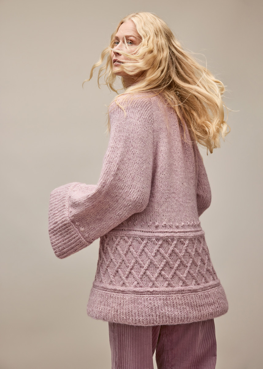 Lana Grossa Natural Alpaca Pelo (63 % Baumwolle, 31 % Alpaka (Baby), 6 % Schurwolle (Merino), Lauflänge = 125 m/50 g): 600 g Rosa meliert (Fb. 15); je eine Rundstricknadel 4 mm und 5 mm, 80 – 100 cm lang (Rd mit geringerem Umfang mit der Magic-Loop- Methode oder je einer zusätzlichen kurzen Rundstricknadel 4 und 5 mm arbeiten); Zopfnadel; 4 Maschenmarkierer.