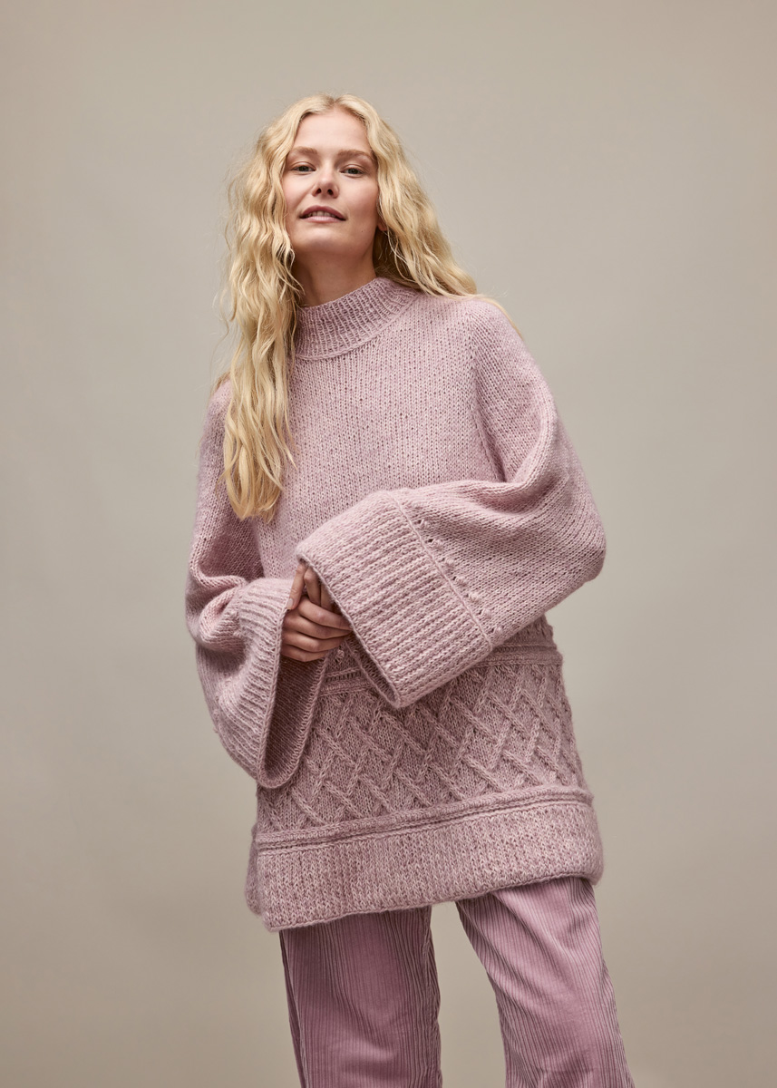 Unser Top-Down-Pullover hat eine Trapezform, die durch breite Bündchen betont wird.