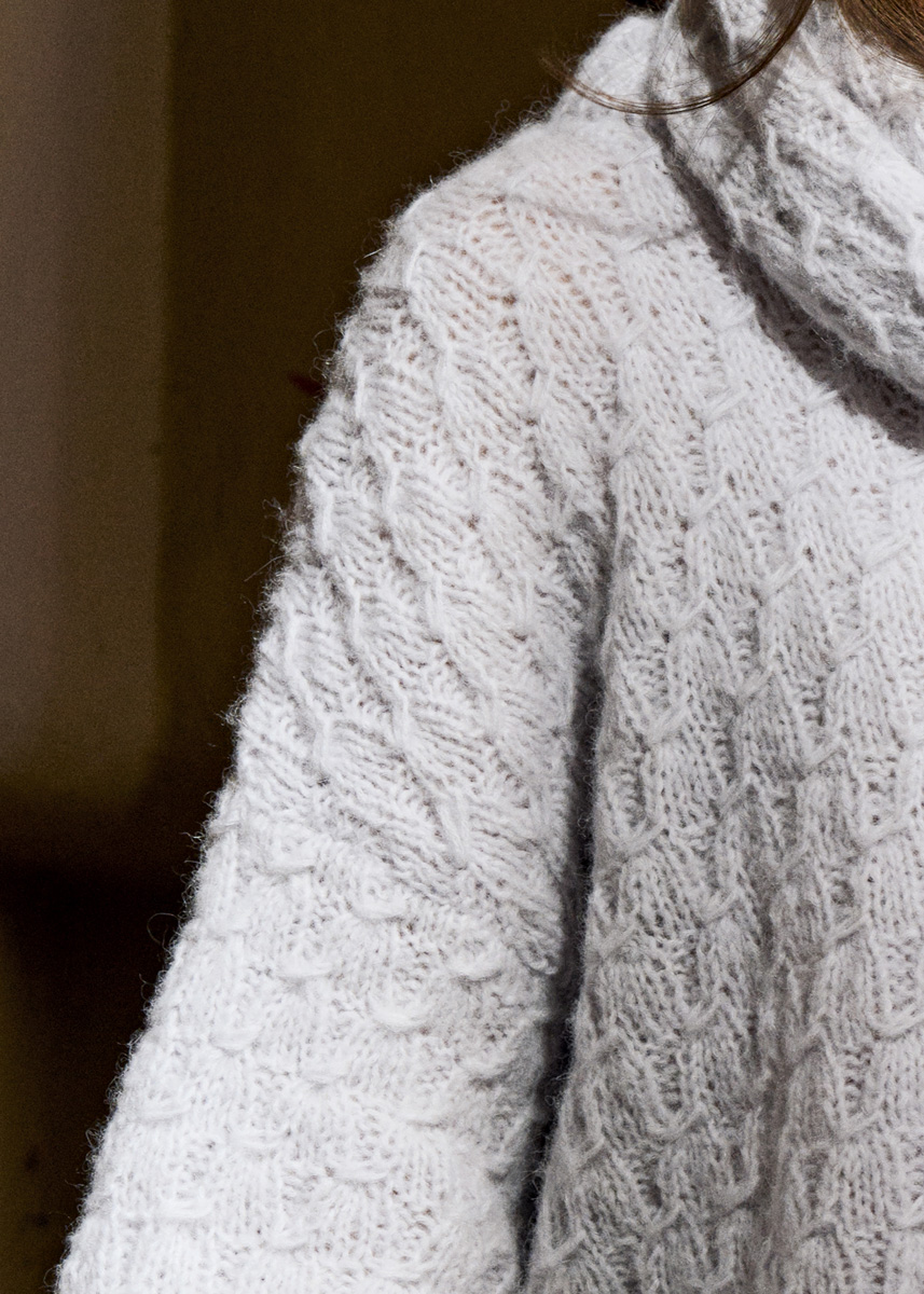 Weißgraues Flauschgarn (neu) und ein effektvolles Rechts-Links-Muster liefern hier ein luxuriöses Strickbild. Der Pulli besteht aus geraden Teilen und hat eine gedoppelte Ausschnittblende.