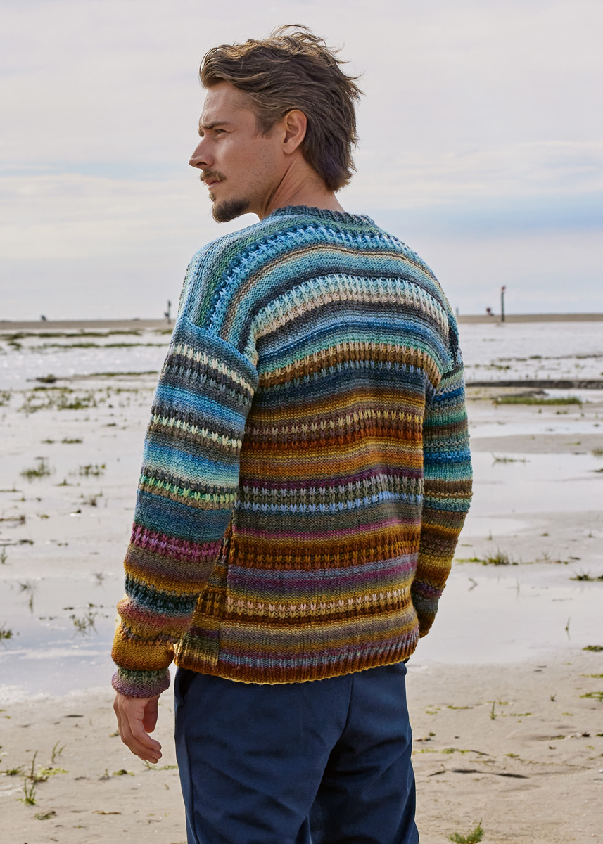 Lana Grossa Pappagallo (90% Schurwolle (Merino extrafine), 10% Polyamid, Lauflänge 250 m/100 g), 400 (500 – 500) g Mokka/Taupe/Camel/Rauchblau/Dunkelviolett/ Rost/Dunkelpetrol/Bordeaux (Fb 9) und 200 (300 – 300) g Petrol/Jade/Dunkelgrau/Grau-/Hellblau/Schwarzbraun/ Camel (Fb 1); Stricknadeln Nr. 5 und 1 Rundstricknadel Nr. 4,5, 40 cm lang, sowie 1 Häkelnadel Nr. 4.