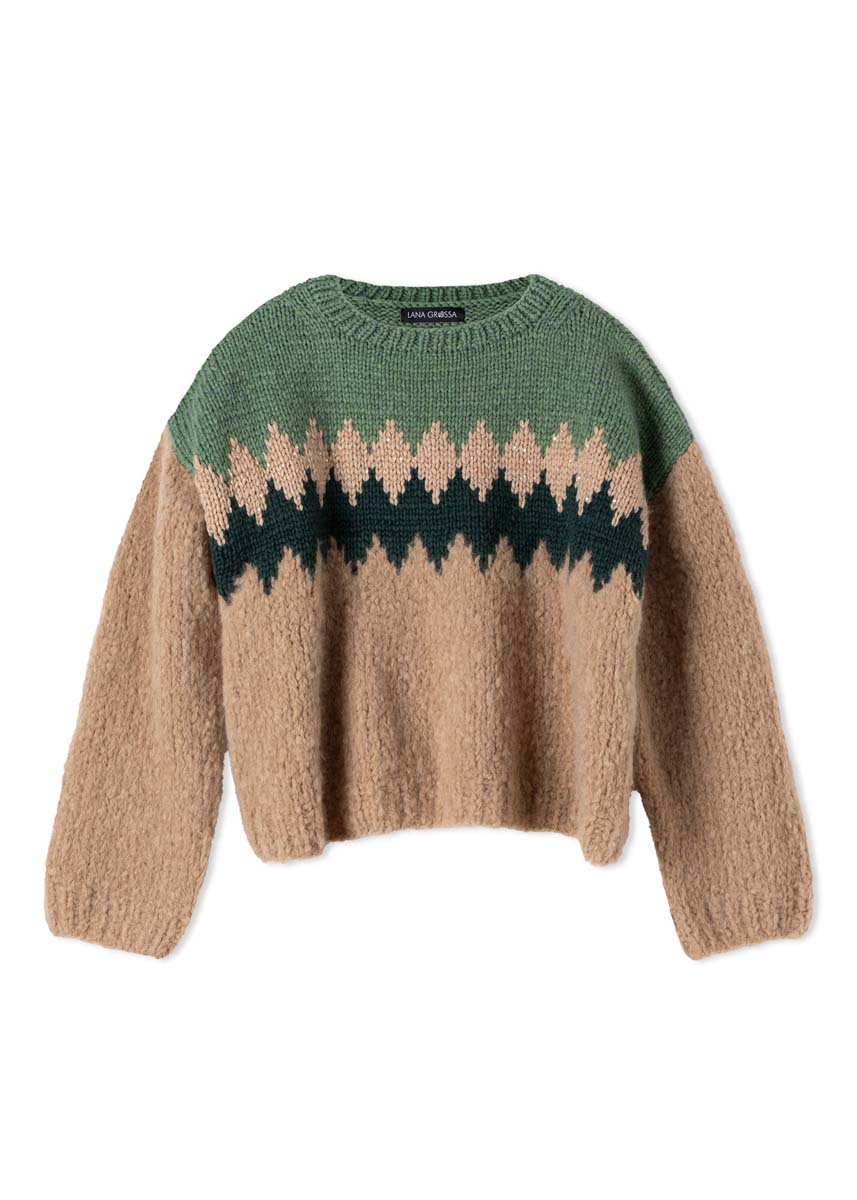 Lana Grossa Royal Alpaca (93% Alpaca (Royal), 7% Polyamid, LL = ca. 95 m/50 g), 250 (300 - 350) g in Beige (Fb 11) und Lana Grossa Winter Softness (62% Schurwolle (Merino extrafein), 38% Baumwolle, LL = ca. 70 m/50 g) 150 (150 - 200) g in Waldgrün (Fb 4), 100 g in Dunkelgrün (Fb 5), 50 g in Beige (Fb 18) und Lana Grossa Glamour (55% Polyamid, 45% Polyester, LL = ca. 112 m/25 g), 25 g in Beige (Fb 10); Stricknd Nr. 7 sowie eine 50 cm lange Rundstricknd Nr. 6.