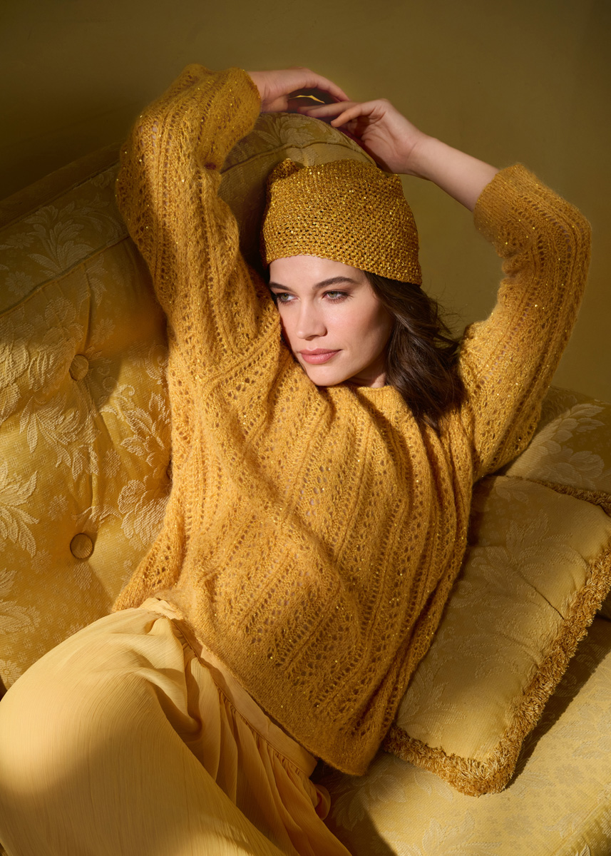 Lana Grossa-Qualität „Setasuri“ (69 % Alpaka (Suri), 31 % Seide, LL = ca 212 m/25 g): ca 150 (200) g Dottergelb (Fb 70); Lana Grossa-Qualität „Glamour“ (55 % Polyamid, 45 % Polyester, LL = ca 115 m/25 g): ca 250 (350) g Goldgelb (Fb 18); Stricknadeln Nr 3 und Nr 3,5; 1 kurze Rundstricknadel Nr 3.