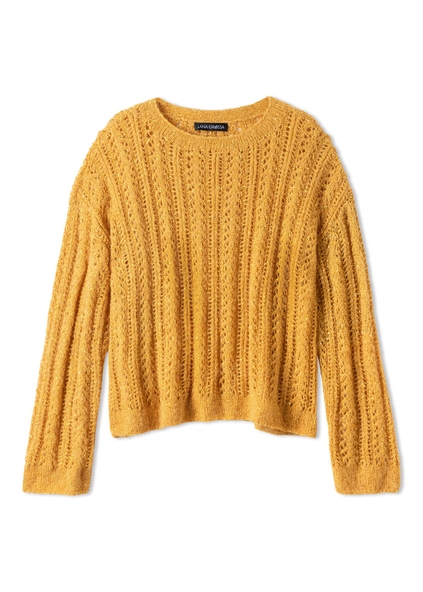 Che bello: Beim dottergelben PULLOVER ergeben Flausch, Pailletten und filigrane Strukturen eine entspannt-elegante Komposition. Das doppelfädig gestrickte Modell besteht aus SETASURI & GLAMOUR