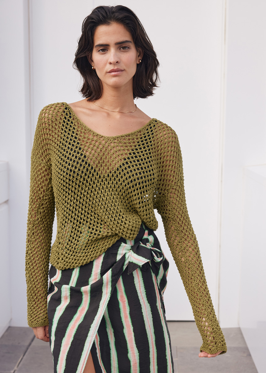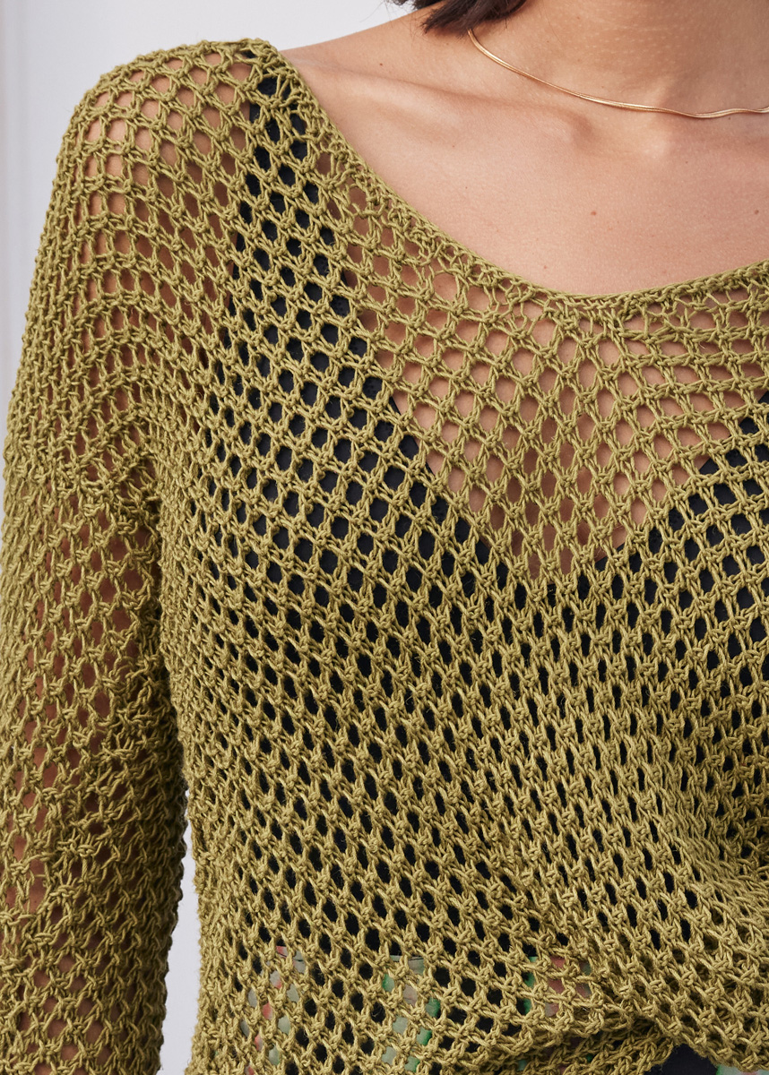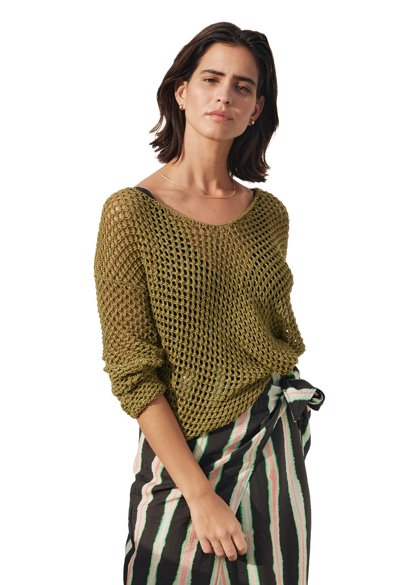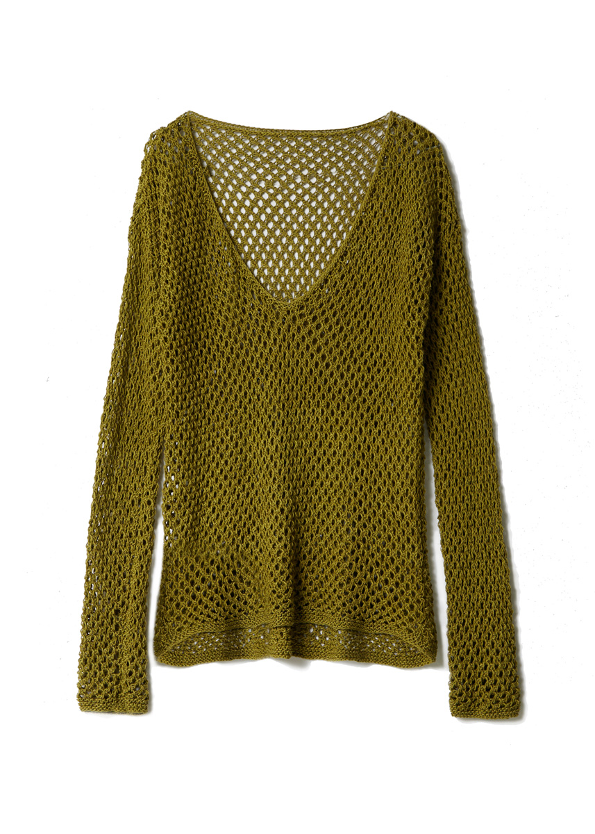 Der olivgrüne V-Neck-Pullover wurde aus einem kühlen Leinengarn gestrickt, das zu 80 Prozent aus recycelten Fasern besteht. Sein Fischnetz- Muster sorgt für eine lockere Sommer-Optik und spannende, halbtransparente Looks.