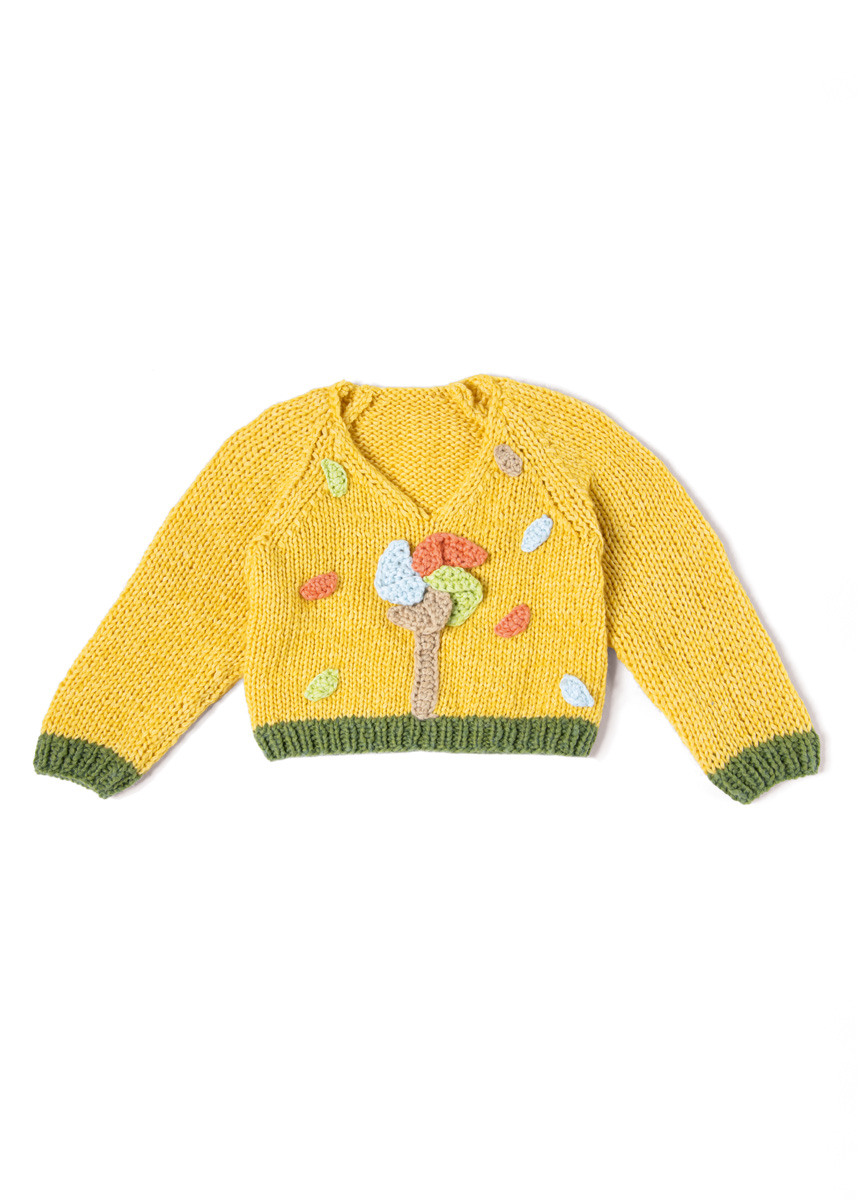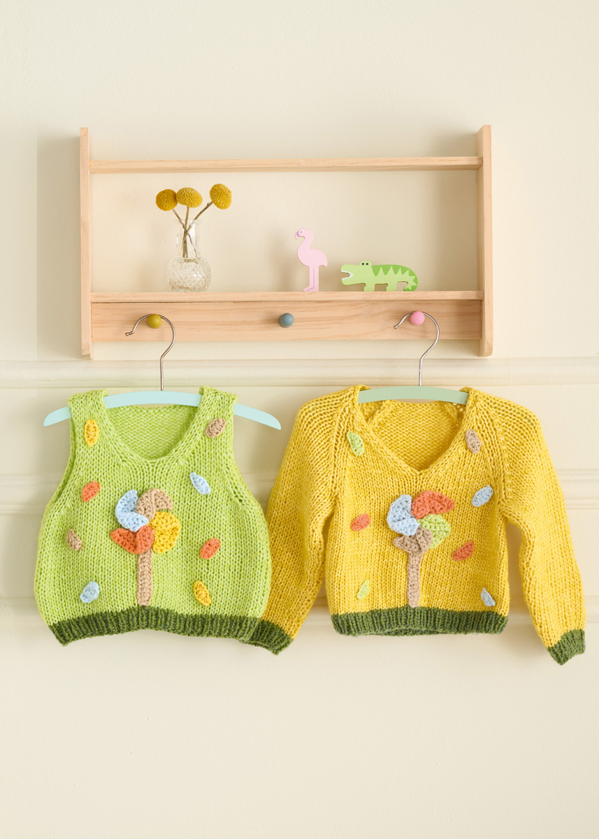 Lana Grossa Summer Softness (80% (Bio) Baumwolle, 20% Schurwolle (Merino superfein); LL = 130 m/50 g): 100 (100/150/150) g Gelb (Fb. 11) und je 50 g Blattgrün (Fb. 14), Beige (Fb. 3), Braunorange (Fb. 22), Frühlingsgrün (Fb. 13) und Pastellblau (Fb. 17); je eine Rundstricknadel 5 mm und 5,5 mm; eine Häkelnadel 5 mm; Maschenmarkierer.