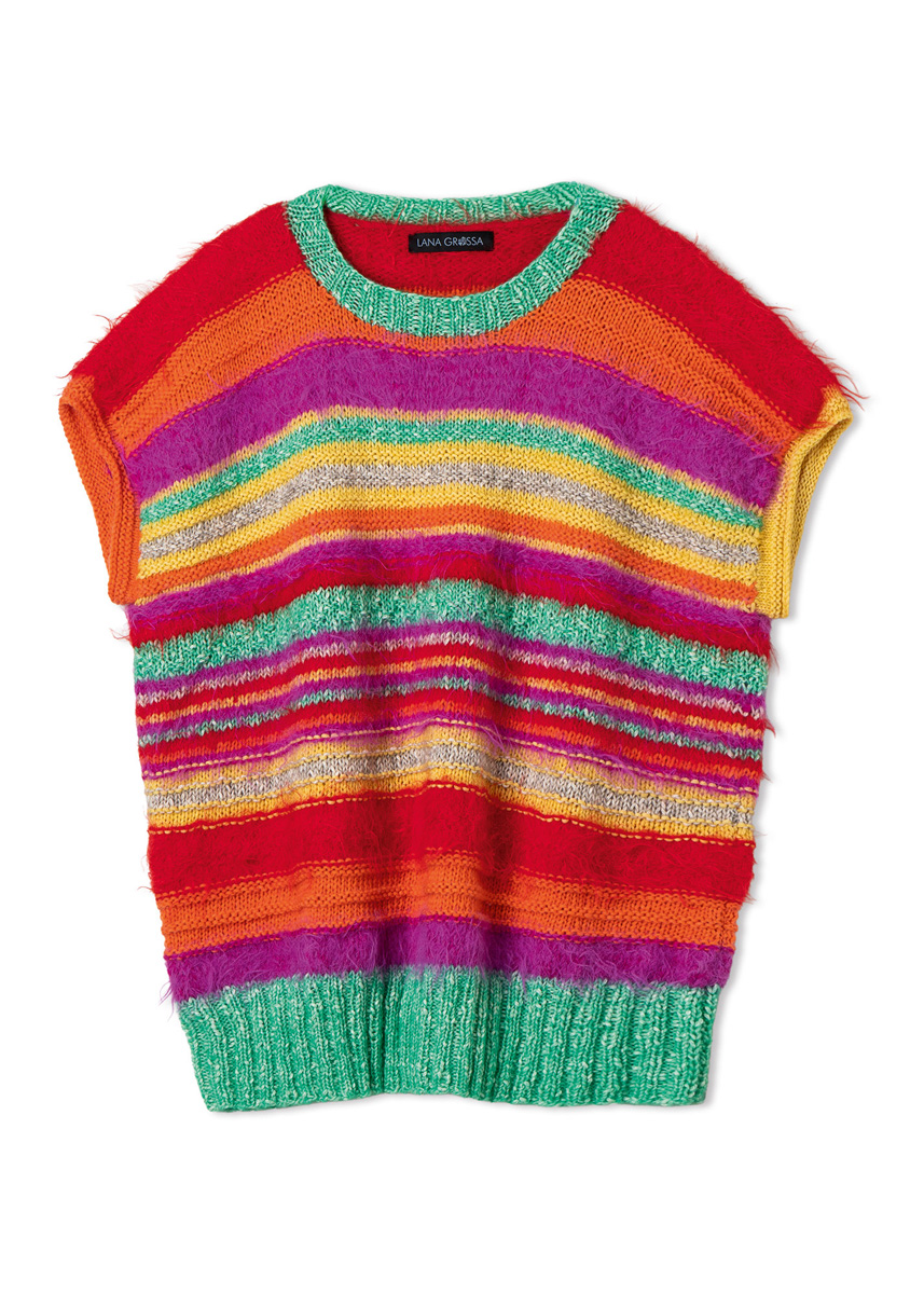 Lana Grossa-Qualität „Basta“ (50 % Schurwolle (Merino), 50 % Polyamid, LL = ca 100 m/50 g): ca 100 (100 - 150 - 150) g Leuchtendrot (Fb 27) und ca 100 (100 - 150 - 150) g Pink (Fb 10); Lana Grossa-Qualität „Bottoni“ (53 % Baumwolle, 24 % Viskose, 23 % Schurwolle (Merino extrafine), LL = ca 125 m/50 g): ca 150 (150 - 150 - 200) g Jade/Rohweiß (Fb 10) und ca 50 (50 - 50 - 50) g Graubeige/Creme (Fb 13); Lana Grossa-Qualität „Summer Softness“ (80 % Baumwolle (Bio), 20 % Schurwolle (Merino superfine), LL = ca 130 m/50 g): ca 100 (100 - 150 - 150) g Kürbis (Fb 6) und ca 50 (100 - 100 - 100) g Gelb (Fb 11); Stricknadeln Nr 4 und Nr 6; 1 kurze Rundstricknadel Nr 4.