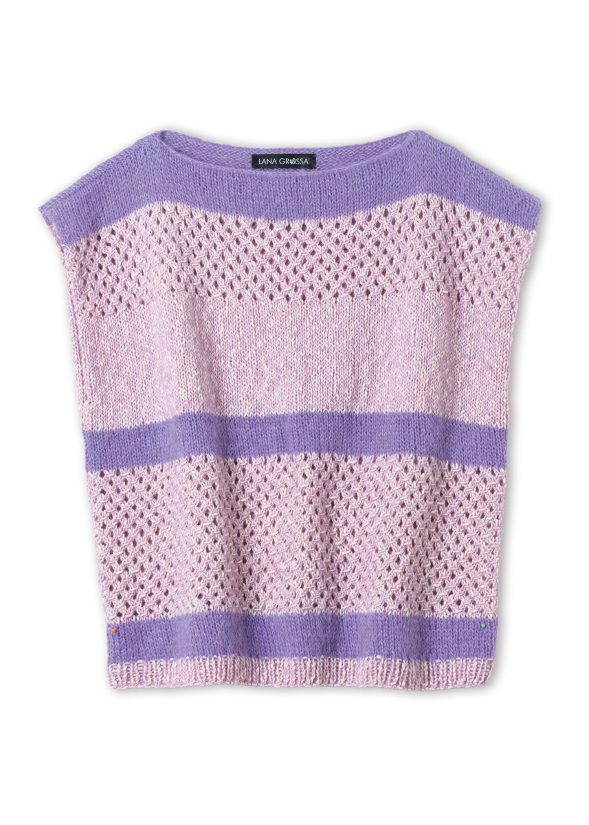 Lana Grossa-Qualität „Setasuri“ (69 % Alpaka (Suri), 31 % Seide, LL = ca 212 m/25 g): ca 50 (50 - 50 - 75) g Violett (Fb 46); Lana Grossa-Qualität „Bottoni“ (53 % Baumwolle, 24 % Viskose (Merino), 23 % Schurwolle (Merino extrafine), LL = ca 125 m/50 g): ca 200 (200 - 250 - 250) g Flieder/Rohweiß (Fb 5); Stricknadeln Nr 4,5.