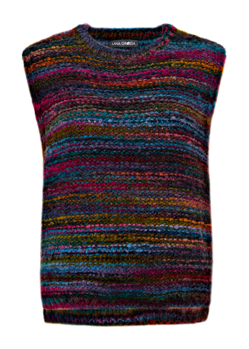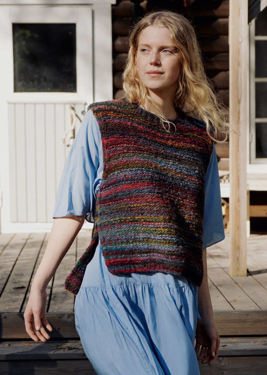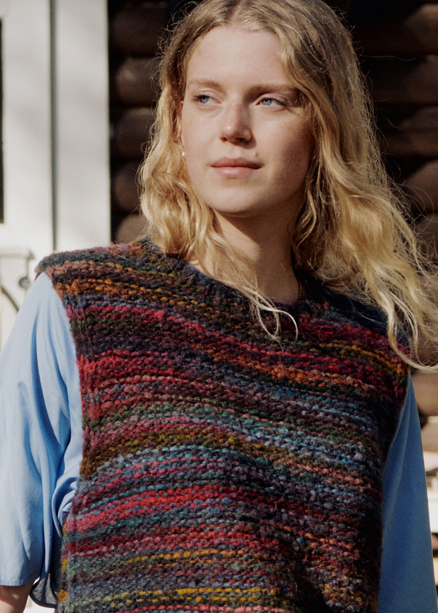 Lana Grossa-Qualität „Twin 50 g“ (46 % (Baby) Alpaka, 45 % Schurwolle (Merino), 9 % Polyamid, Lauflänge 85 m/50 g): ca. 200 (250 – 300) g Graublau/Pink/Oliv/Dunkelgrün/Lila/Ocker/Graugrün/ Petrol (Fb. 201); Stricknadeln Nr. 7, 1 Rundstricknadel Nr. 7, 40 cm lang.