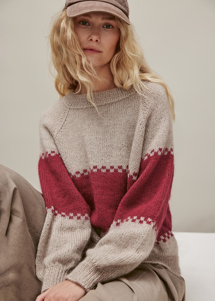 Lana Grossa Natural Lama Fine (100 % Lama (Baby), Lauflänge = 150 m/50 g): 200 (250 / 250 / 300) g Graubeige (Fb. 112) und 150 (150 / 200 / 200) g Weinrot (Fb. 117) und Lana Grossa Silkhair (70 % Mohair (Superkid), 30 % Seide, Lauflänge = 210 m/25 g): 50 (75 / 75 / 75) g Bordeaux (Fb. 113) und 75 (75 / 100 / 100) g Perlbeige (Fb. 123); je eine Rundstricknadel 4 mm und 5 mm, 80 – 100 cm lang (Rd mit geringerem Umfang mit der Magic-Loop-Methode oder je einem zusätzlichen Nadelspiel in 4 mm und 5 mm arbeiten); 5 Maschenmarkierer, einer davon in einer anderen Farbe oder Form zur Markierung des Rundenübergangs (TIPP: für Anfänger ist es hilfreich, Markierer mit Ziffern 0 bis 4 zu verwenden. Alternativ kleine Etiketten mit Ziffern an die Markierer hängen.)