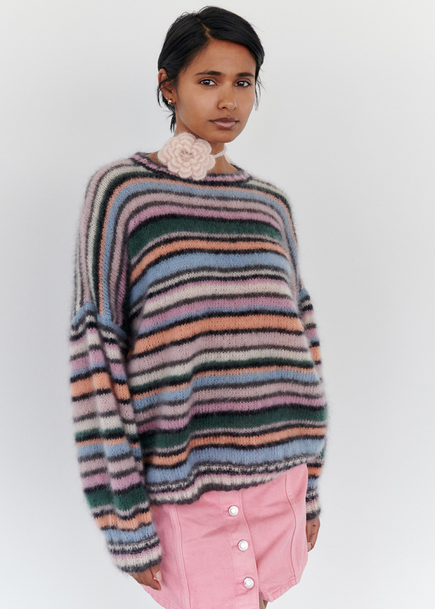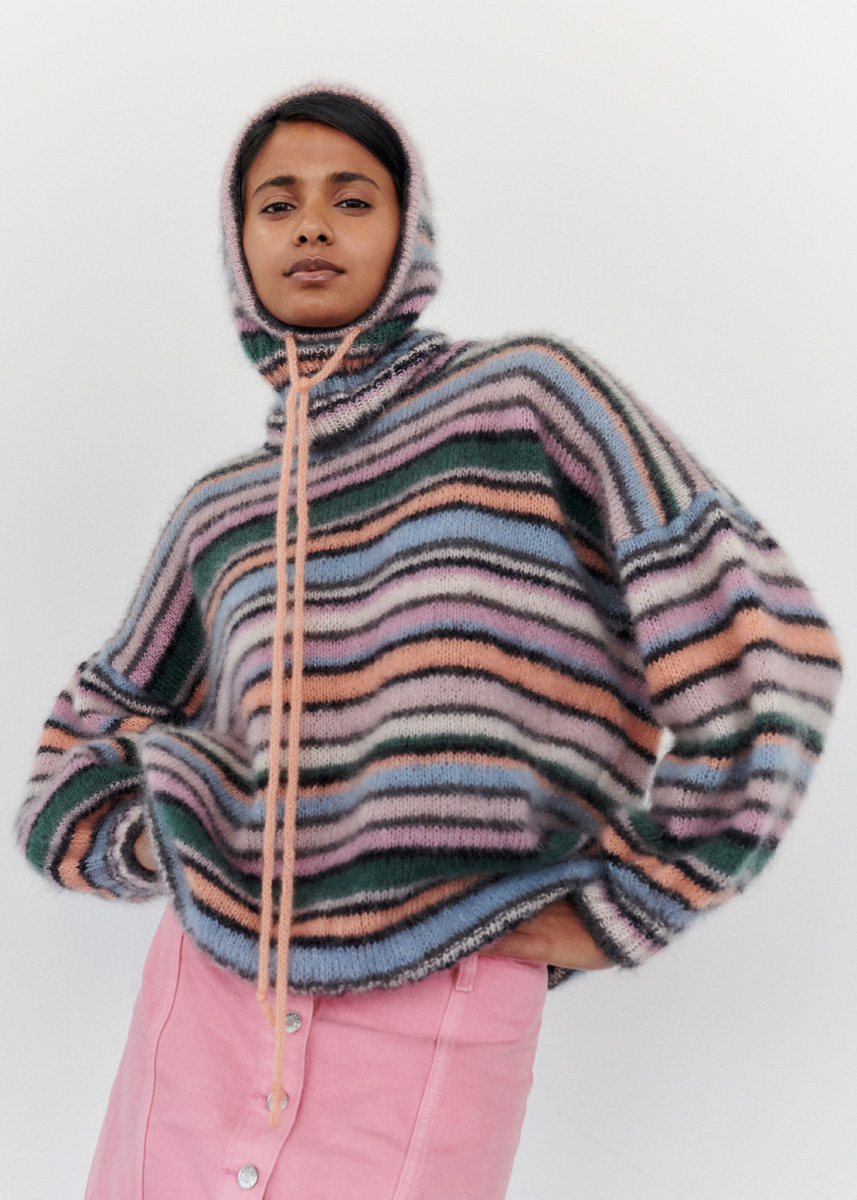 Lana Grossa „Silkhair“ (70% Mohair (Superkid), 30% Seide, Lauflänge 210 m/25 g), 50 g Anthrazit (Fb 183), 50 g Schwarz (Fb 14), 50 g Zartrosa (Fb 93), 50 g Pastellflieder (Fb 150), 50 g Graublau (Fb 196), 50 g Lachs (Fb 159), 50 g Dunkelgrün (Fb 110), 50 g Zartlila (Fb 87); Rundstricknadeln Nr 3,5, Länge 40 cm (alternativ Nd-Spiel Nr 3,5); Stricknadeln Nr 3,5 und 4