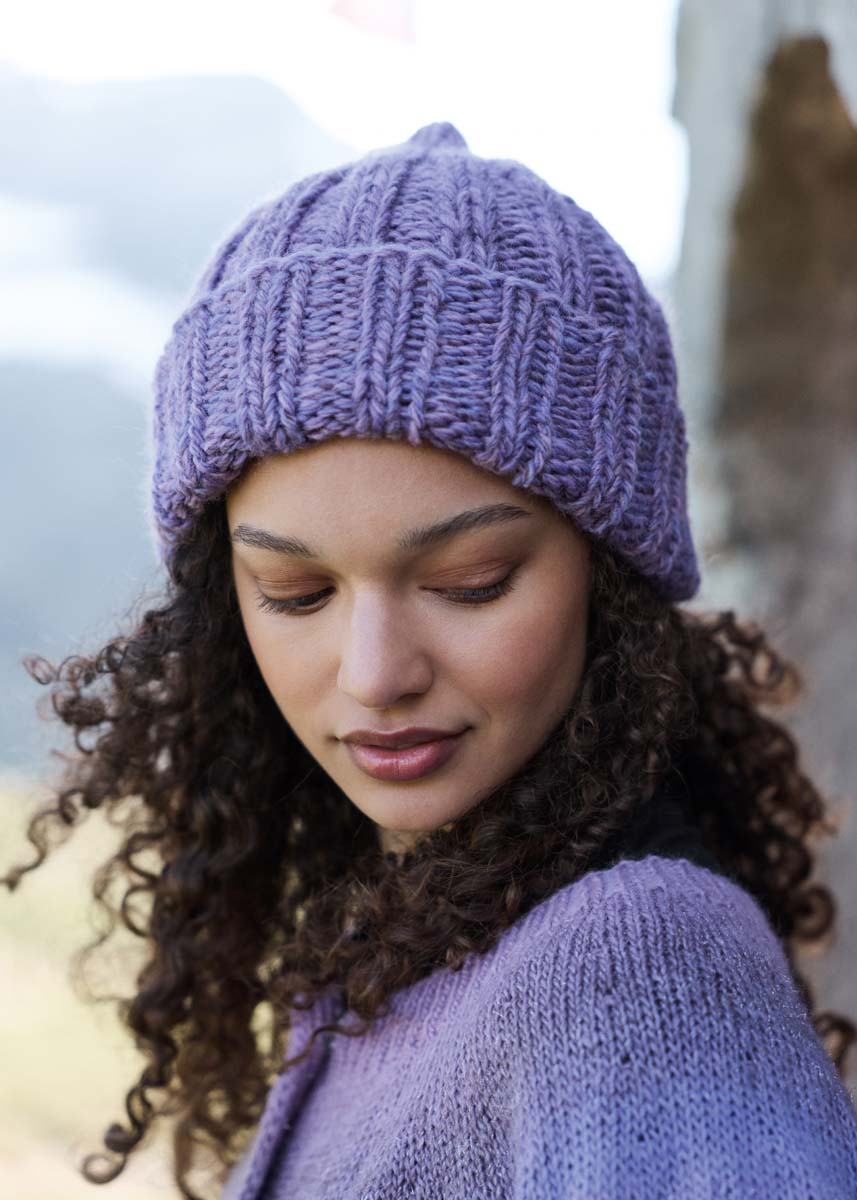 Lana Grossa-Qualität „Gomitolo Versione“ (60 % Schurwolle, 40 % Polyacryl, LL = ca 700 m/200 g): 1 Knäuel = ca 200 g Antikviolett/Flieder/Amethyst/Veilchenlila (Fb 460); 1 kurze Rundstricknadel und/oder Nadelspiel Nr 8.