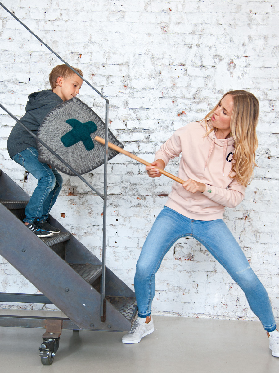 Lana Grossa Feltro (100% Schurwolle, Lauflänge 50 m/50 g), 300 g Grau meliert (Fb 3), 100 g Dunkelgrau meliert (Fb 4) und 50 g Petrolgrün (Fb 31); Stricknadeln Nr. 8 und 15, 1 Häkelnadel Nr. 10, 1 Holzstange, 36 cm lang, Ø 25 mm.