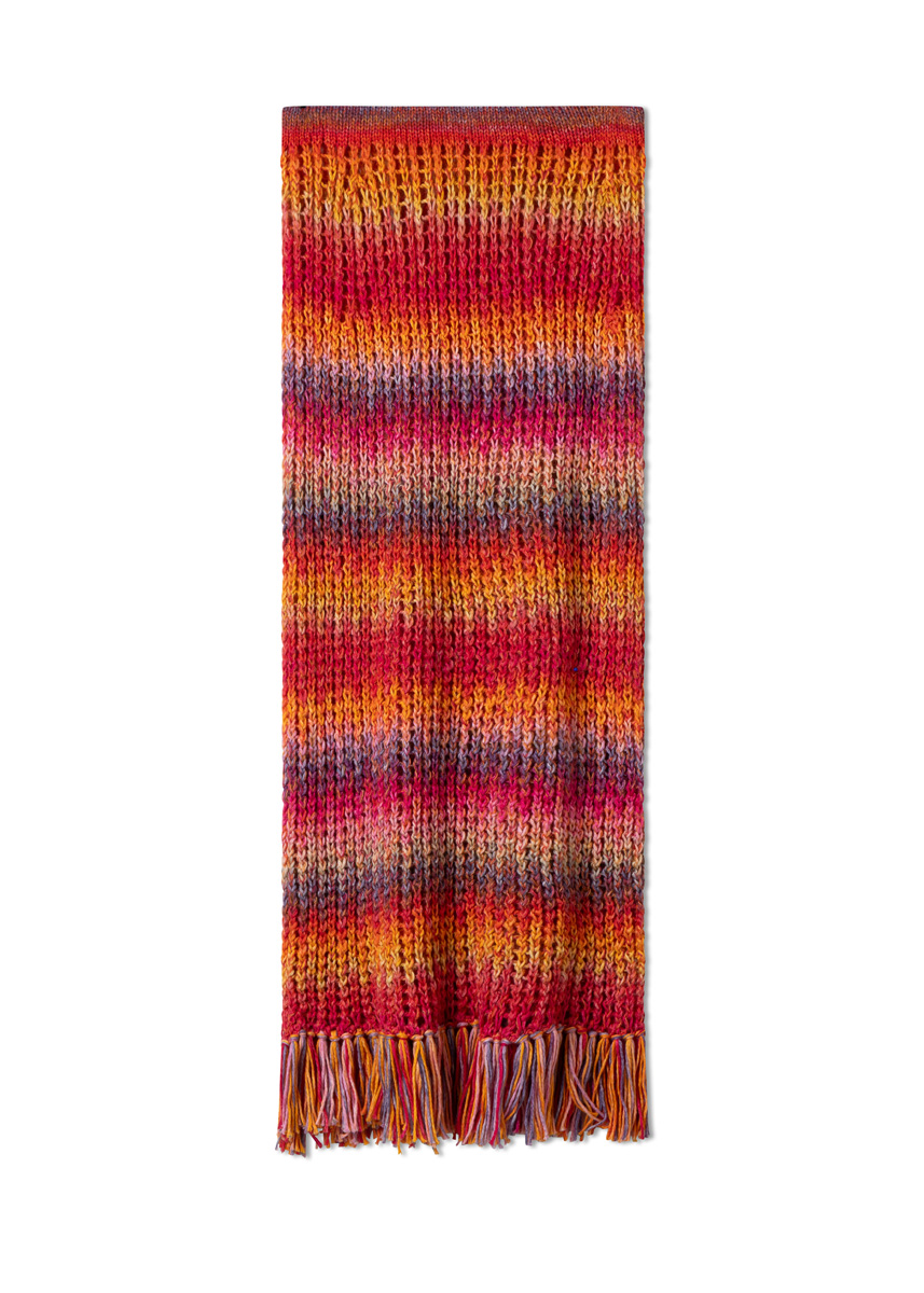 Lana Grossa Cotonella (100% (Pima) Baumwolle, Lauflänge 280 m/100 g), 300 (300) g in Camel/Pink/Fuchsia/Rotviolett/Grau/Flieder/Gelborange/ Rot/Gelb (Fb 19) und Lana Grossa Cottonhair (70% Mohair (Superkid), 30% Baumwolle, Lauflänge 450 m/50 g), 100 (100) g in Hummer/ Orange/Hellorange/Pink/Fuchsia/Rost (Fb 101); Rundstricknadel Nr 4 und Nr 6, je 80 cm lang, 1 Häkelnadel Nr 5, 2 Maschenmarkierer, ca. 82 (90) cm Gummiband, 2 cm breit.