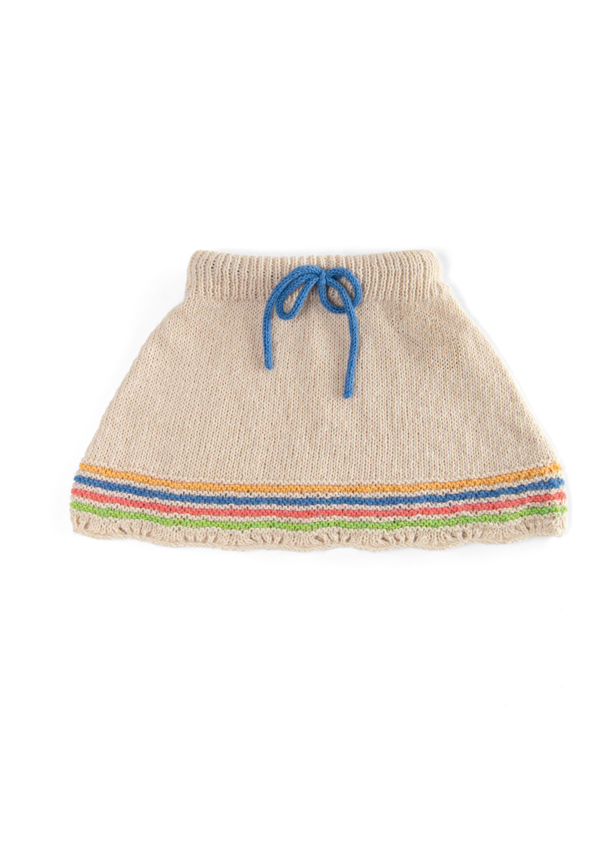 Lana Grossa Ecopuno (72% Baumwolle, 17% Schurwolle (Merino), 11% Alpaka (Baby); LL = 215 m/50 g): 100 (100/100/150) g Perlbeige (Fb. 66) und je 50 g Frühlingsgrün (Fb. 215), Enzianblau (Fb. 213), Hummer (Fb. 90) und Safrangelb (Fb. 216); je eine Rundstricknadel 3,5 mm und 4 mm; eine Häkelnadel 3 mm; Maschenmarkierer; 42 (46/50/56) cm Gummiband, 3 cm breit.