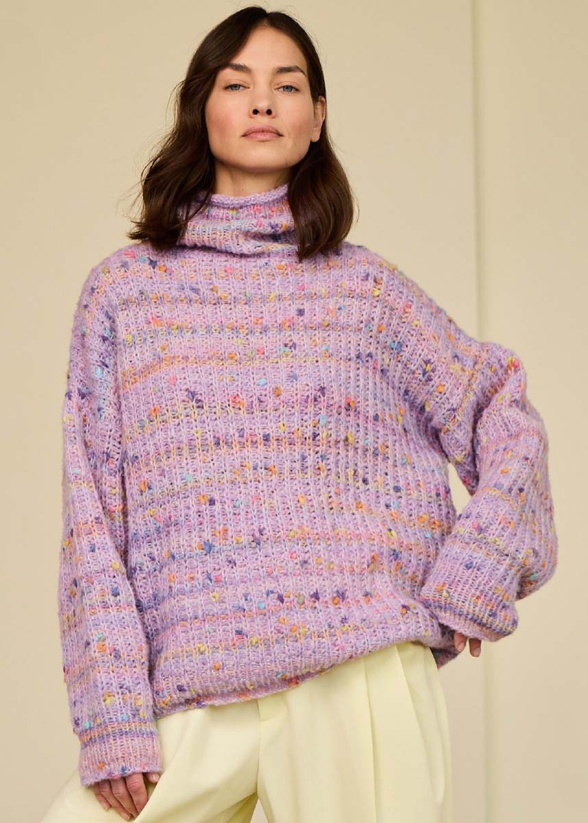 Lana Grossa-Qualität „Cassata“ (54 % Schurwolle (Merino extrafine), 30 % Polyamid, 16 % Baumwolle, LL = ca 175 m/50 g): 300 (350 - 350 - 400) g Zartlila/Rosa/Gelb/ Lila (Fb 3); Stricknadeln Nr 5 und 5,5; 1 kurze Rundstricknadel Nr 5.