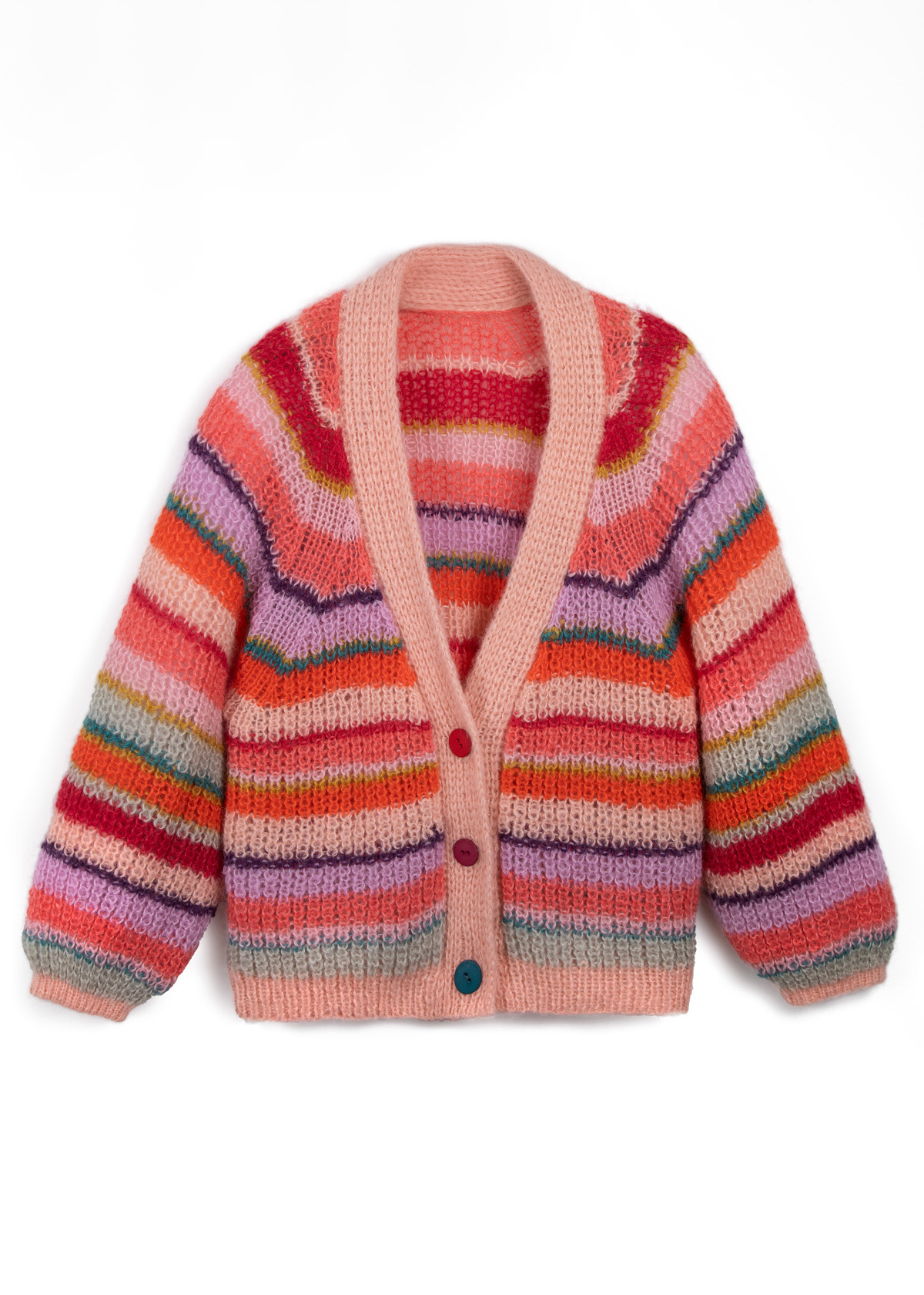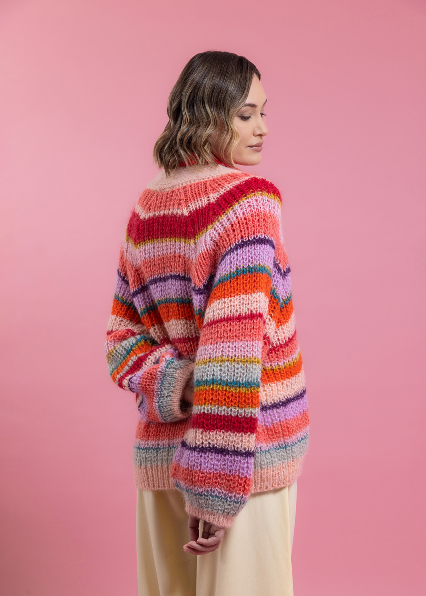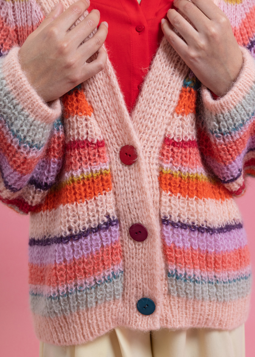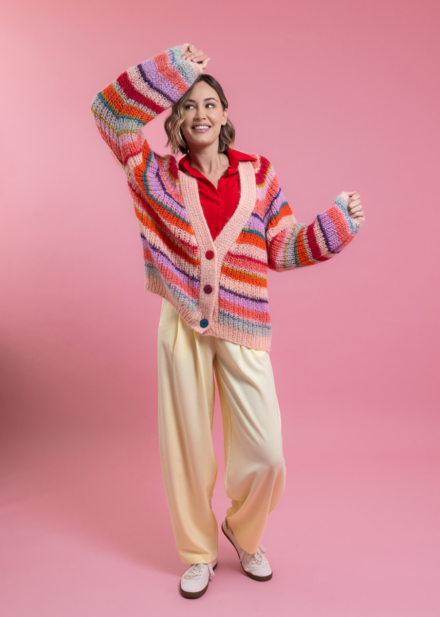 Der Cardigan wird doppelfädig und nahtlos in einem Stück von oben nach unten gestrickt. Die Blende wird dreifädig separat gestrickt und angenäht. Das Modell hat eine Gesamtlänge von 60 (62 - 64 - 66 - 68 - 70) cm und eine Brustmehrweite von 26 cm bei 80 cm Brustumfang (26 cm bei 88 cm Brustumfang - 26 cm bei 96 cm Brustumfang - 30 cm bei 104 cm Brustumfang - 28 cm bei 116 cm Brustumfang - 22 cm bei 128 cm Brustumfang).