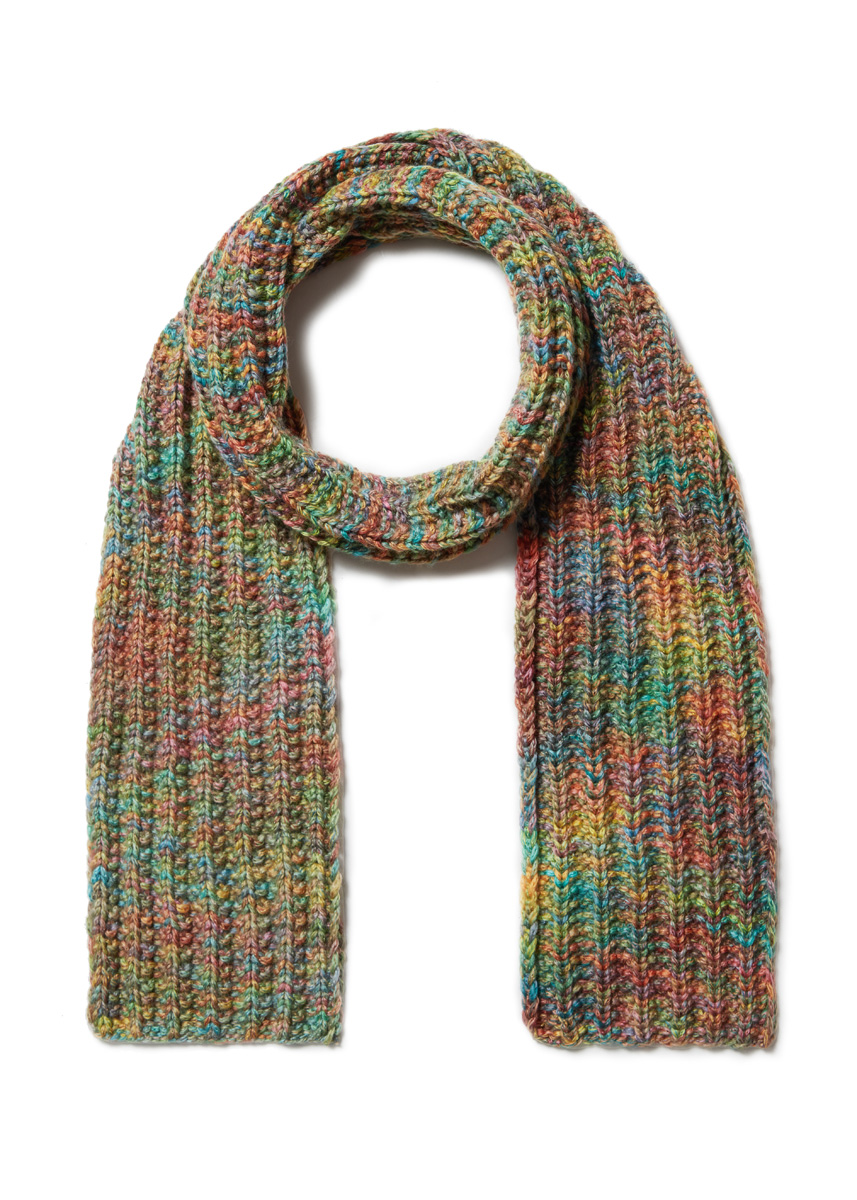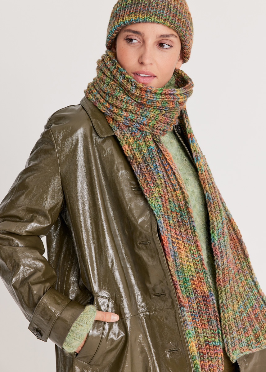 Ein neues, bedrucktes Kettengarn sorgt hier für klare Strukturen und effektvolle Farbenspiele. Die Mütze wird in Rippen gestrickt, der Schal im falschen Patent.