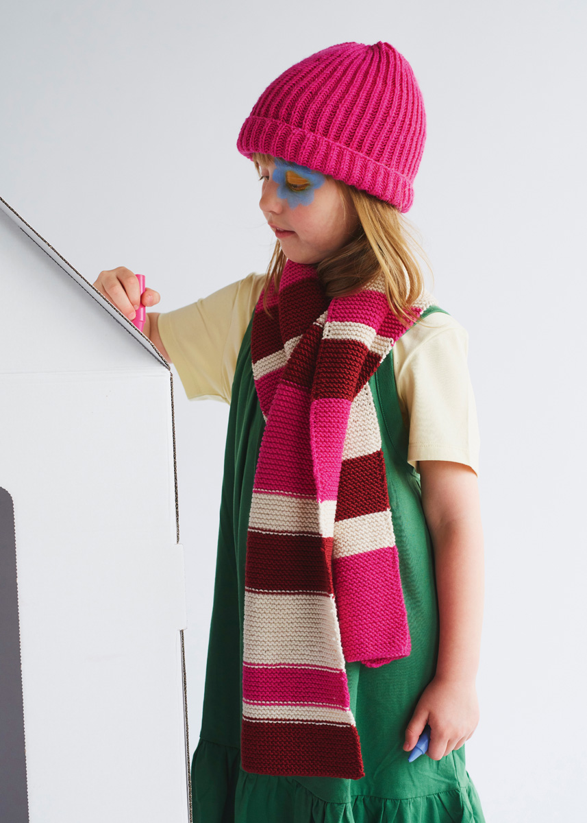 Lana Grossa Cool Wool (100% Schurwolle, Lauflänge 160 m/50 g), 100 g Zyklam (Fb 537), 50 g Natur (Fb 590) und 50 g Indischrot (Fb 2068); Stricknadeln Nr. 4.