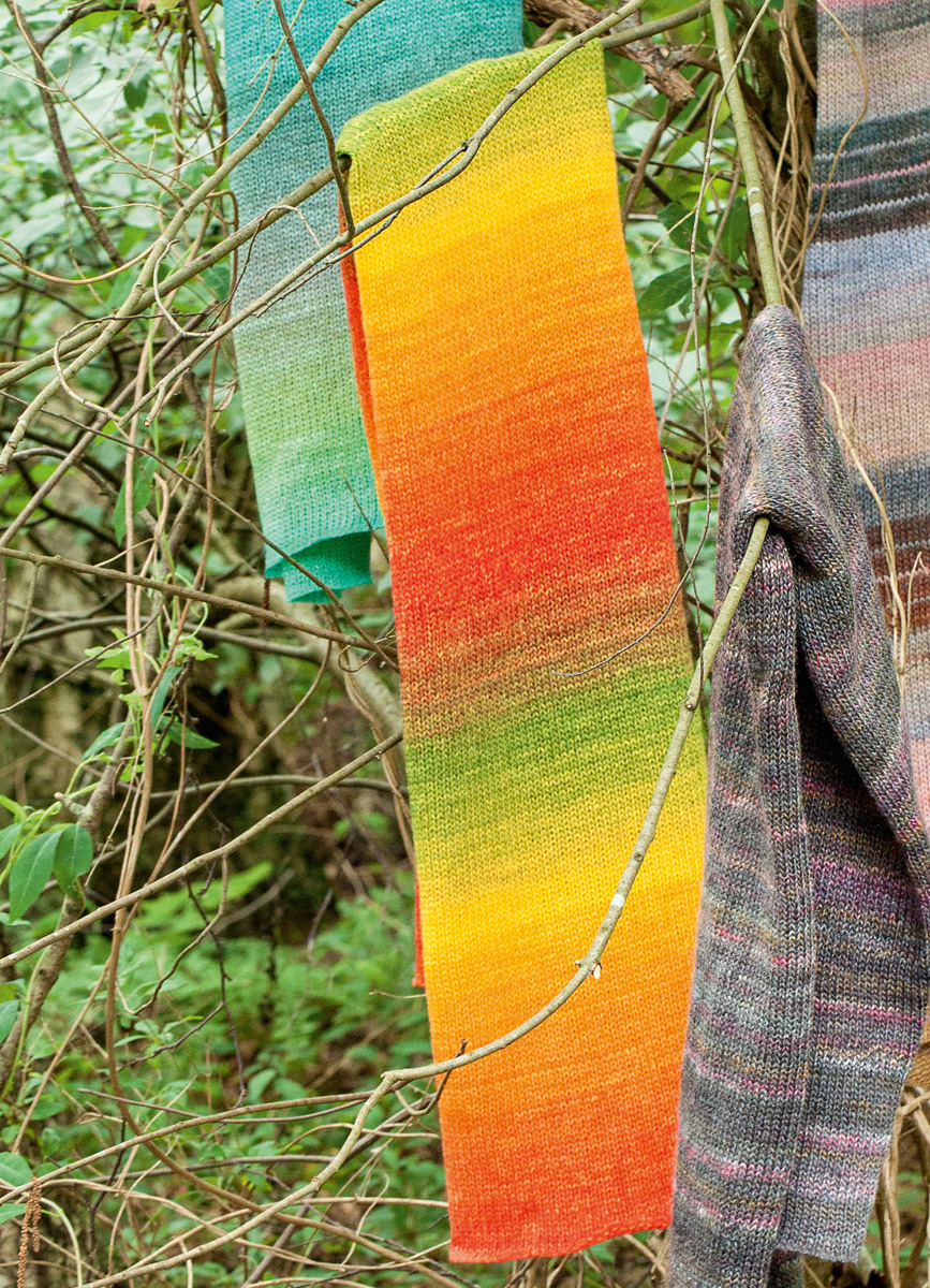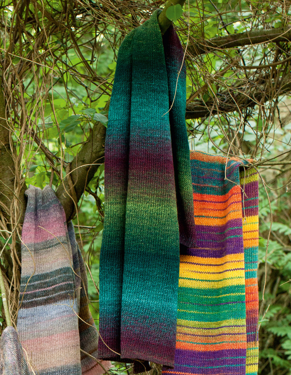 Lana Grossa Gomitolo Versione (60% Schurwolle, 40% Polyacryl, Lauflänge 700 m/200 g), 200 g Petrol/Grau/Kiwi/Smaragd/Türkis (Fb 414) oder Oliv/Rot/Orange/Gelb/Gelbgrün/Grün (Fb 411) oder Bordeaux/Türkis/Schwarz-/Gelbgrün (Fb 416); Stricknadeln Nr. 4,5.