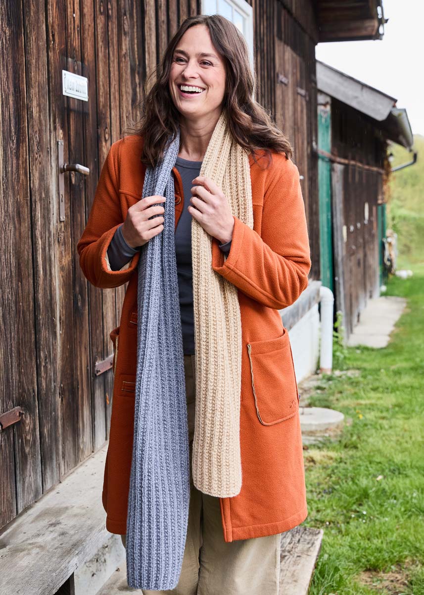 Lana Grossa-Qualität „Landlust- Naturwolle“ (100% Norwegische Schurwolle, LL ca. 85 m/50 g), je 200 g in Grau (Fb 9) und in Beige (Fb 17); Stricknadeln Nr. 5.