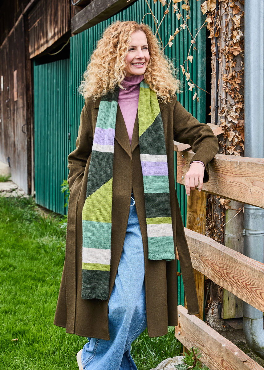 Lana Grossa-Qualität „Landlust- Alpaka-Merino 160“ (50% Schurwolle (Merino), 50% Alpaka (Baby), LL ca. 160 m/50 g), je 50 g in Hellbeige (Fb 402), Kiwigrün (Fb 443), Schilfgrün (Fb 432), Moosgrün (Fb 423) und Flieder (Fb 440); Stricknadeln Nr. 4,5.