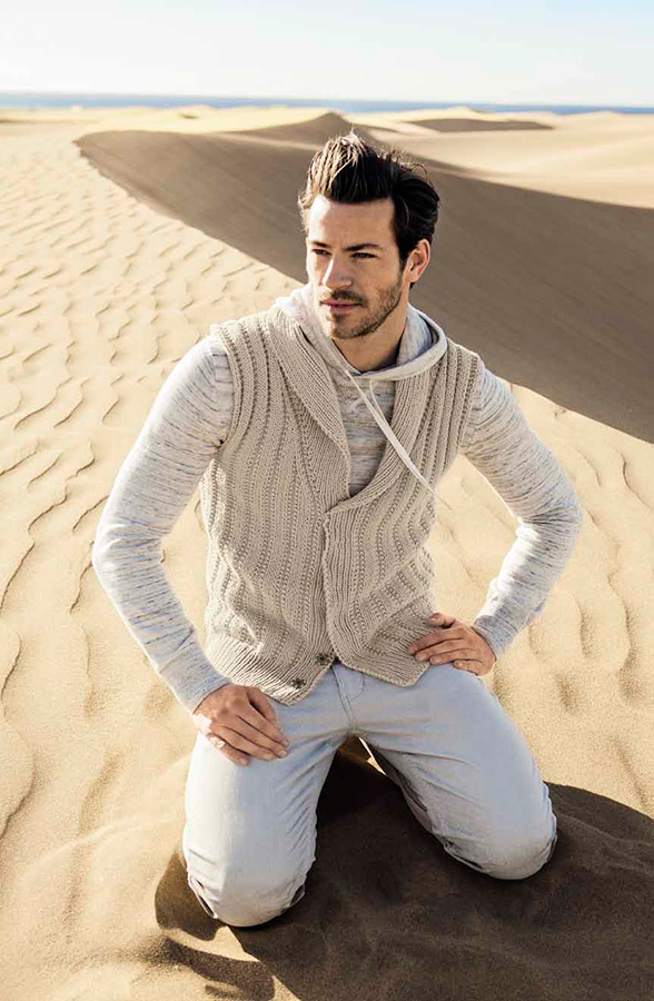Lana Grossa-Qualität „Elastico Big” (96 % Baumwolle, 4 % Polyester (Elité), LL = ca. 105 m/50 g): ca. 500 (550) g Beige (Fb. 3); Stricknadeln Nr. 5,5 und 6; 6 Druckknöpfe zum Annähen von Union Knopf, Art. 59217, 21 mm Ø, Fb. 851 messing.