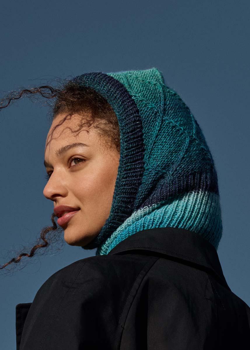 Lana Grossa-Qualität „Gomitolo Fumo“ (50 % Schurwolle, 50 % Polyacryl, LL = ca 700 m/200 g): 1 Knäuel = ca 200 g Mint/Türkis-/Seegrün/Hell-/Dunkelpetrol/Anthrazit (Fb 511); 1 kurze Rundstricknadel oder Nadelspiel Nr 4,5.