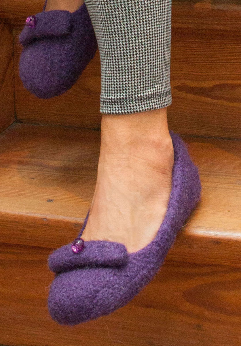 Lana Grossa Feltro (100% Schurwolle, Lauflänge 50 m/50 g), Gr. 28: 100 g Perlviolett (Fb 74), Gr. 39: 150 g Pflaume (Fb 54); 1 Spiel Stricknadeln Nr. 8, 2 Knöpfe von JIM KNOPF, Art. 11286, Fb 04 (Gr. 28) bzw. 05 (Gr. 39), Gr. 15 mm.