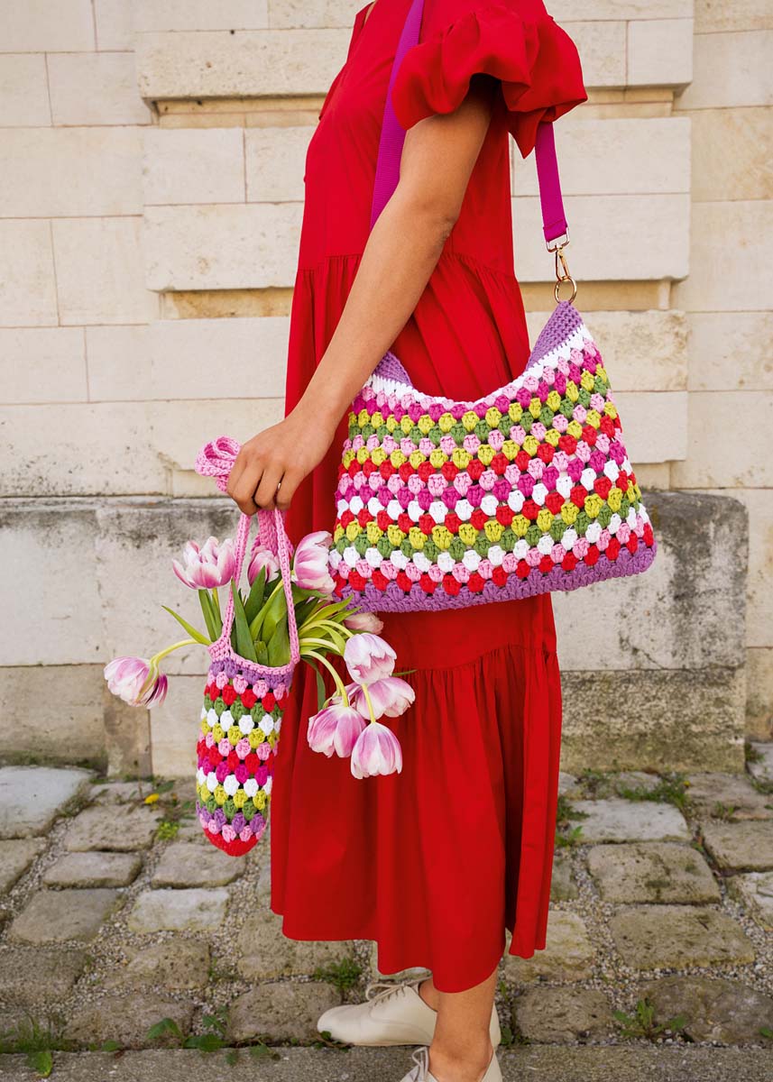 Lana Grossa Natural Cotton (100 % Baumwolle (Bio), Lauflänge 80 m/50 g): je 50 g in Lila (Fb 8), Rot (Fb 7), Rosa (Fb 10), Weiß (Fb 17), Grün (Fb 3), Frühlingsgrün (Fb 4) und Pink (Fb 9); Häkelnadel Nr 4,5, Reißverschluss, ca. 38 cm lang, 2 Karabinerringe goldfarben, Durchmesser ca. 3 cm, 2 Karabinerhaken goldfarben, ca. 3 cm breit; Gurtband ca. 3 m breit und ca. 90 cm lang
