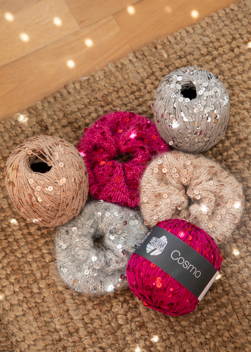 Der Scrunchie Mila ist ein stilvolles Accessoire mit besonderem Charme. Zweifädig aus Finito und Cosmo gestrickt, vereint er weiche Haptik mit einem dezenten Paillettenschimmer. Das glatt-rechts-Muster unterstreicht die hochwertige Garnkombination und sorgt für eine zeitlose, elegante Optik.
