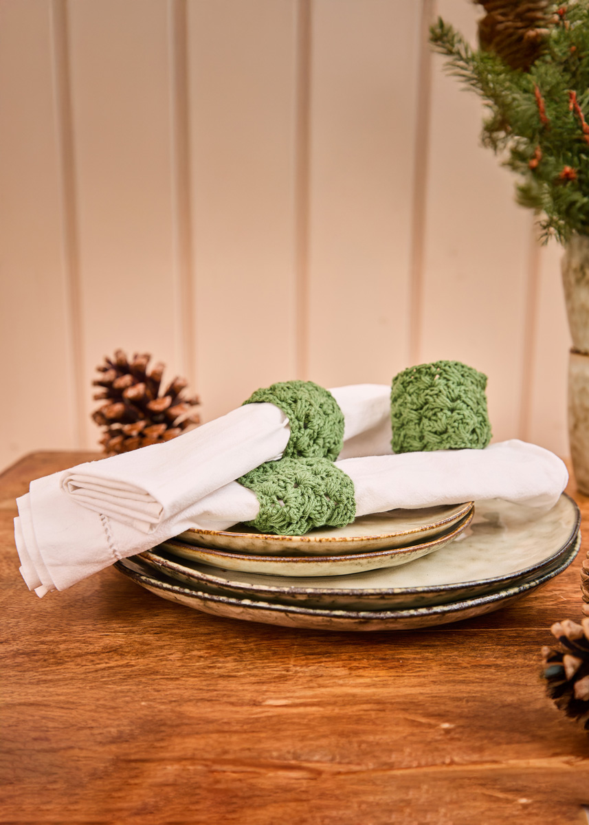Für ca. 5 Ringe Lana Grossa- Qualität „Landlust-Sommerseide“ (50 % Seide, 50 % Baumwolle, LL ca. 170 m/50 g), 50 g in Moosgrün (Fb 57); Häkelnadel Nr. 3,5.