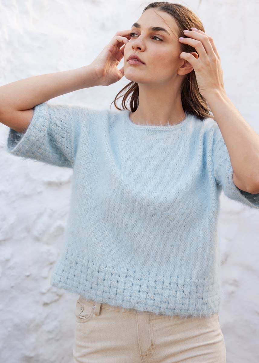 Flausch plus Pastell- farbe – eine Kombi, die zwei Trends auf einmal bedient. Die Boxy-Form des Shirts wird durch ein einfaches Flechtmuster aufgelockert.