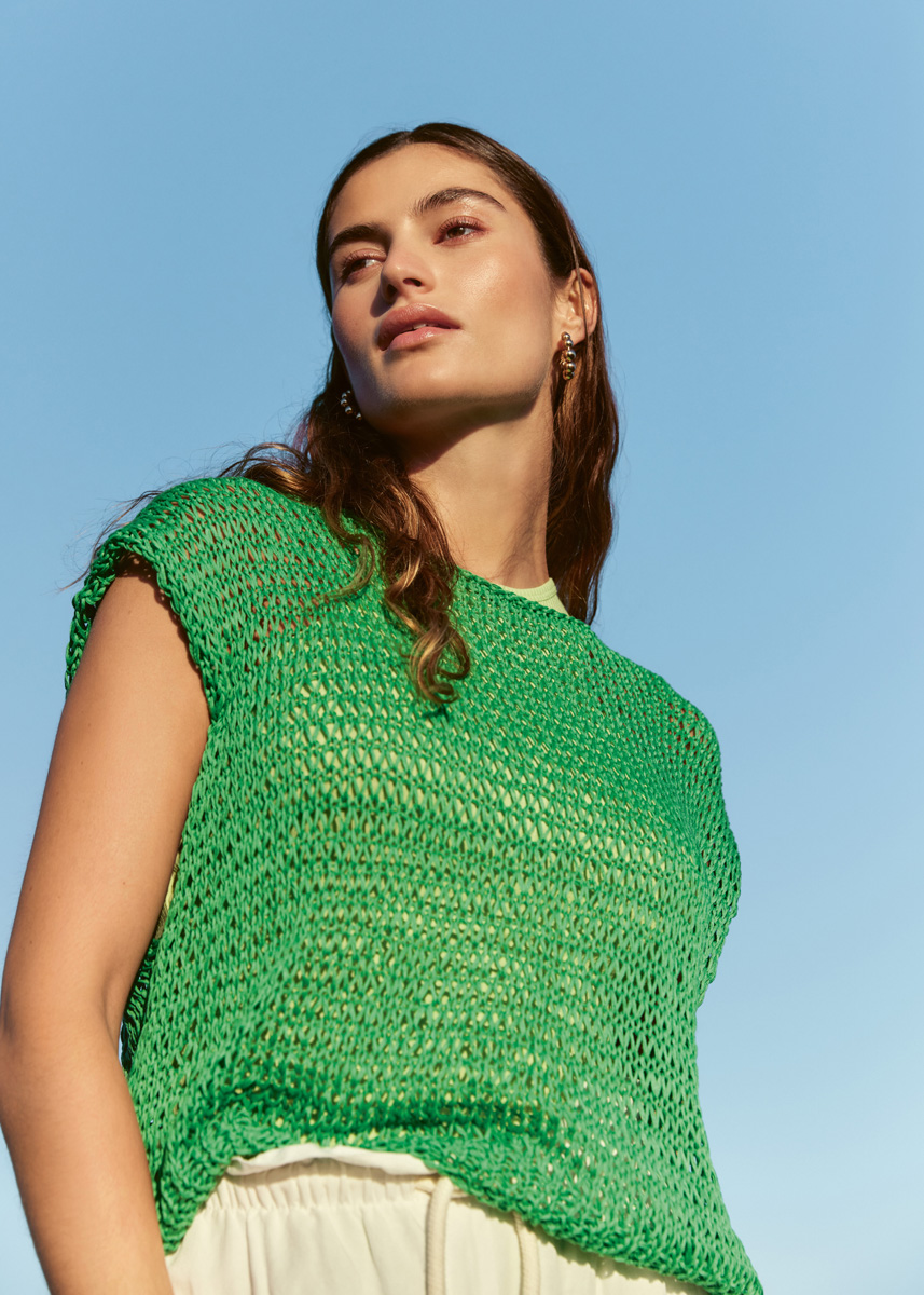 Mit doppeltem Faden und etwas Ehrgeiz gestrickt, ist dieses Sommershirt auch für Last-Minute-BucherInnen noch zu schaffen. Denn was nach kompliziertem Muster aussieht, ist ganz einfach glatt rechts gestrickt: Die offene Maschenstruktur entsteht wie von selbst durch die Verwendung unterschiedlicher Nadelstärken.