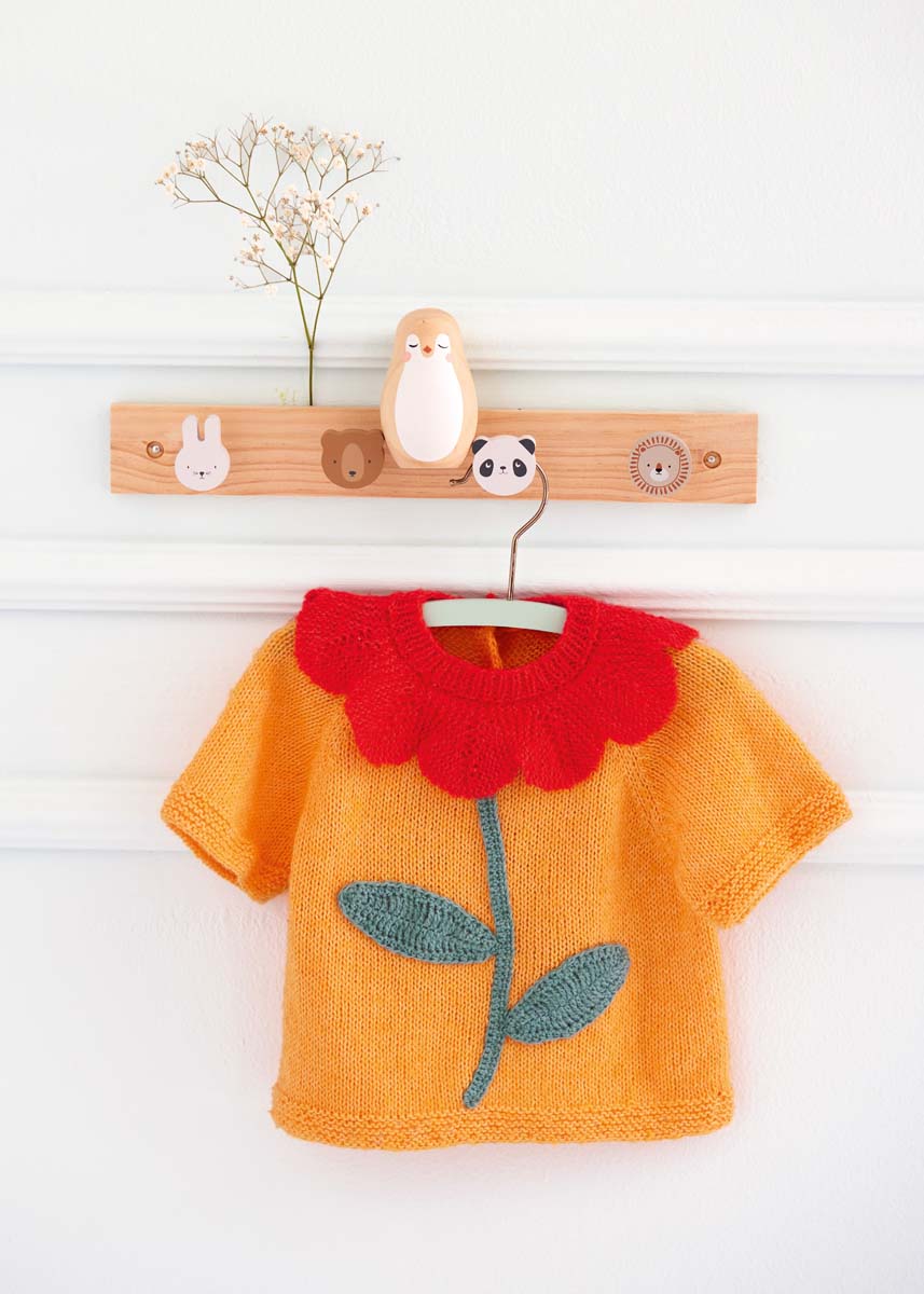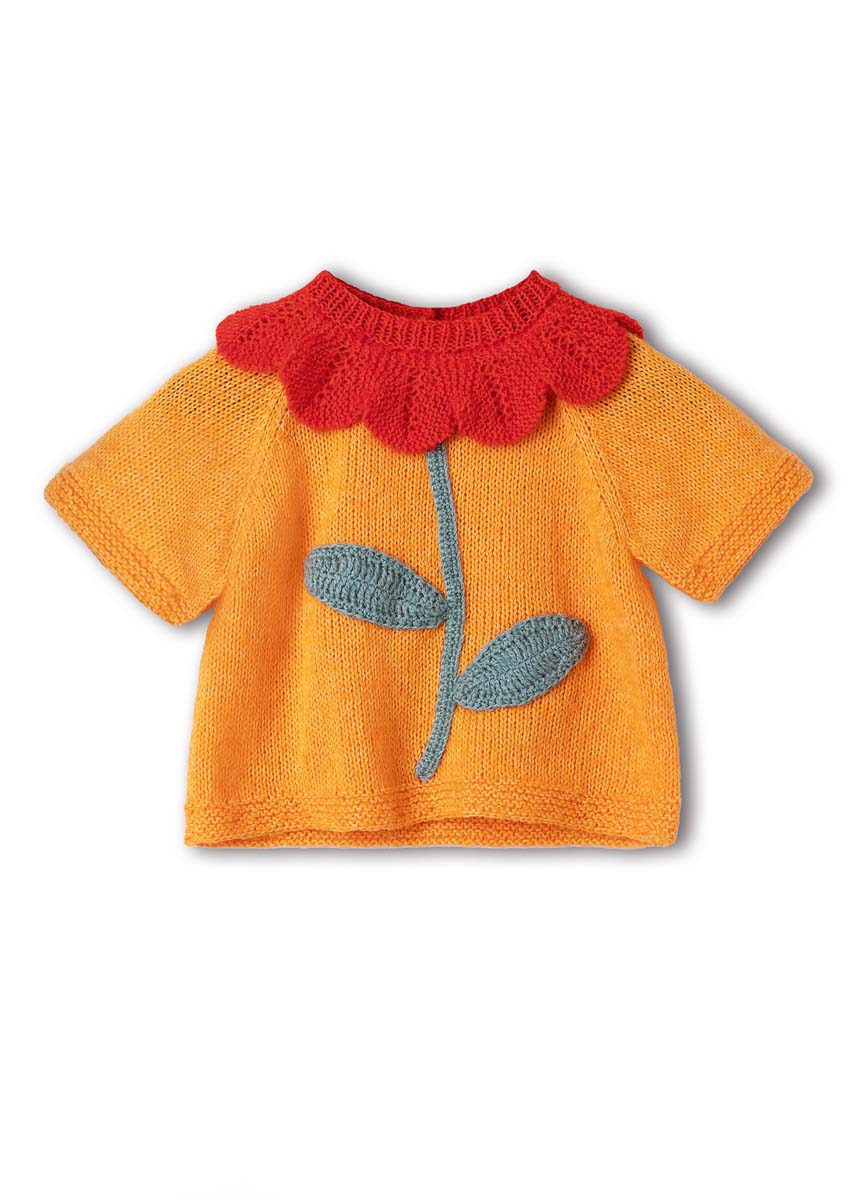 Lana Grossa Sottile (85% Baumwolle, 15% Schurwolle (Merino); LL = 250 m/50 g): 50 (100/100/100) g Orange (Fb. 2) und je 50 g Salbeigrün (Fb. 14) und Leuchtendrot (Fb. 4); je eine Rundstricknadel 3,5 mm und 4 mm; eine Häkelnadel 3 mm; Markierer; 3 Kunststoff-Druckknöpfe zum Annähen mit 7 mm Ø.