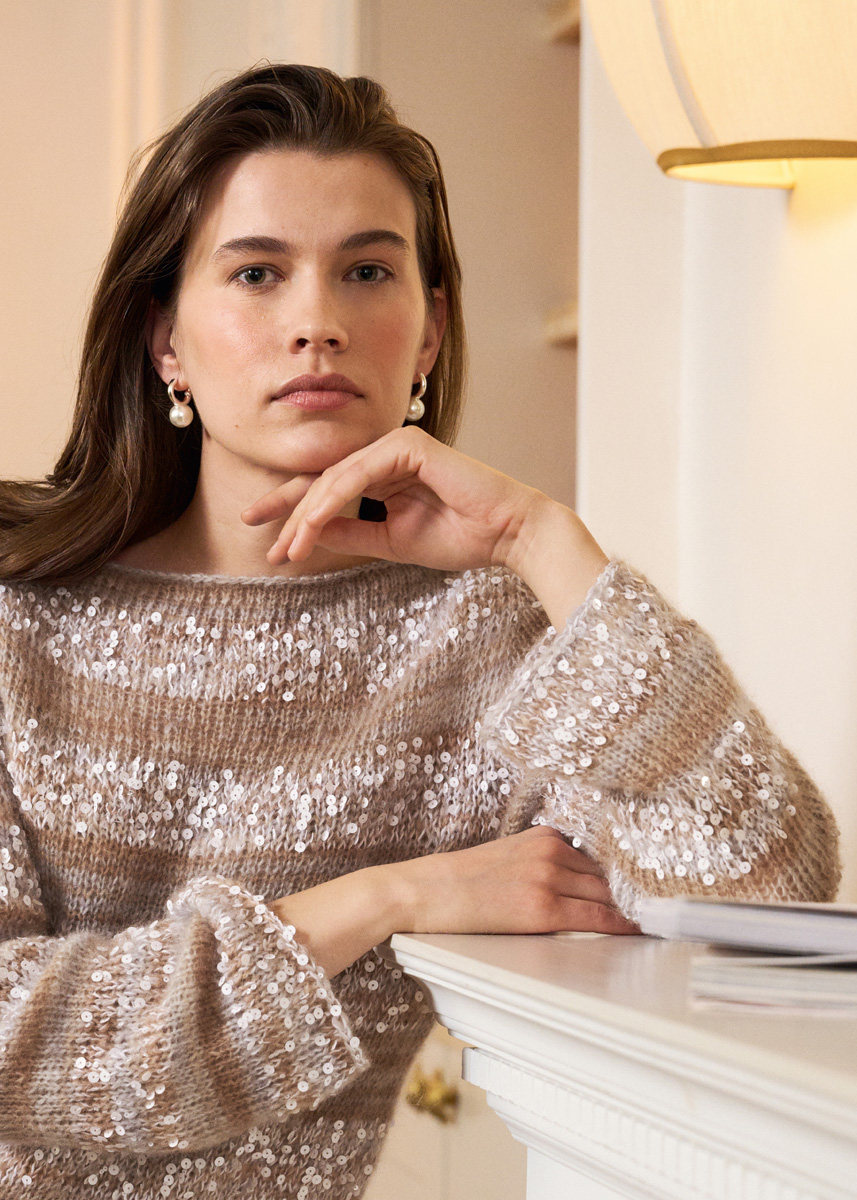 Paillettengarnierte Streifen und ein bedruckter Seiden-Mohair-Mix ergeben dieses Schmuckstück. Das Modell hat eine Rundpasse und wird, entsprechend, von oben nach unten gestrickt.