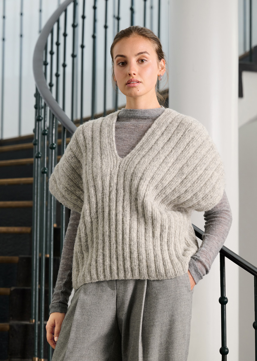 Lana Grossa Airy (42% Alpaka (Baby), 40% Baumwolle, 18% Schurwolle (Merino extrafein), Lauflänge 170 m/ 50 g) 250 (300 – 350) g Weißgrau (Fb. 12); Stricknadeln Nr. 3,5 und 4.