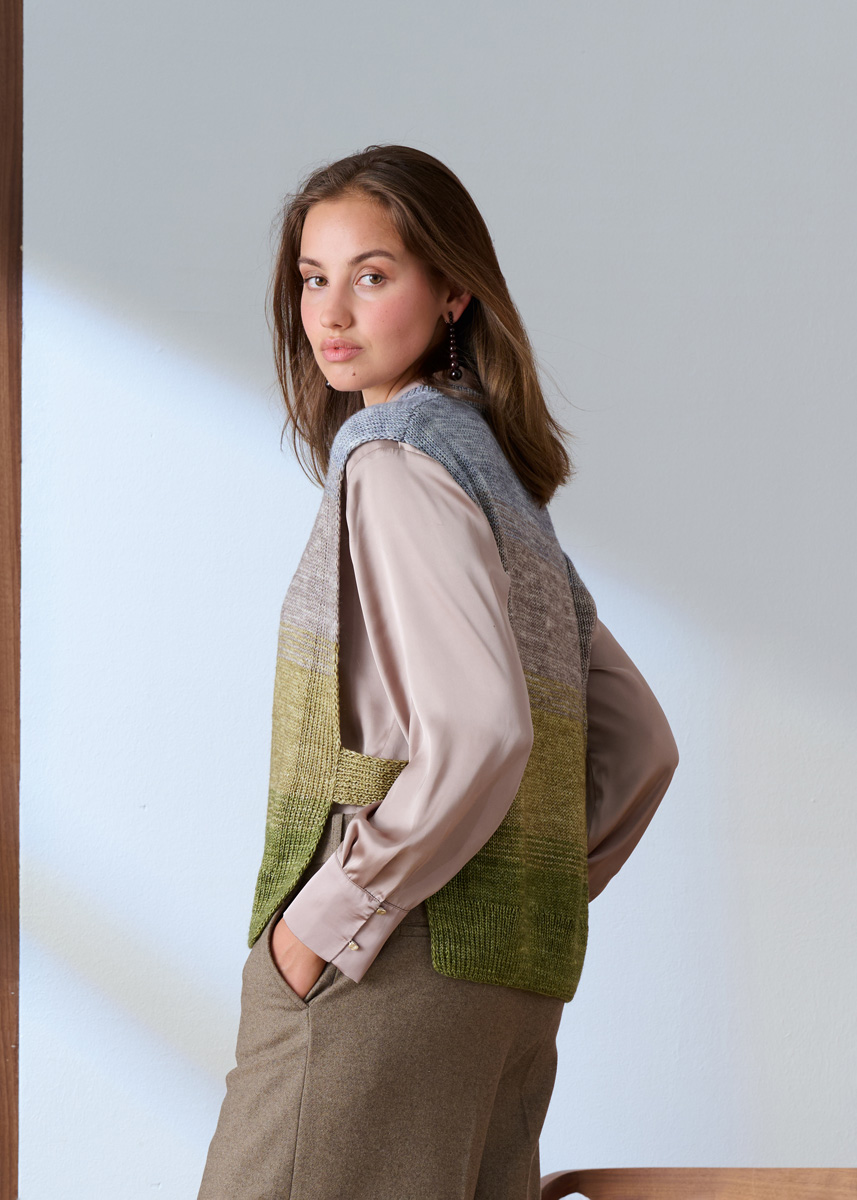 Lana Grossa Brigitte Silkdream (60% Schurwolle (Merino Fein), 30% Seide, 10% Mohair (Superkid), Lauflänge 270 m/50 g), 50 (100 – 100) g Oliv (Fb. 7), 50 (100 – 100) g Khaki (Fb. 6), 50 (100 – 100) g Graubeige (Fb. 4) und 50 (100 – 100) g Grau (Fb. 15); 1 Rundstricknadel Nr. 4, 60 cm lang und 1 Rundstricknadel Nr. 3,5, 40 cm lang.