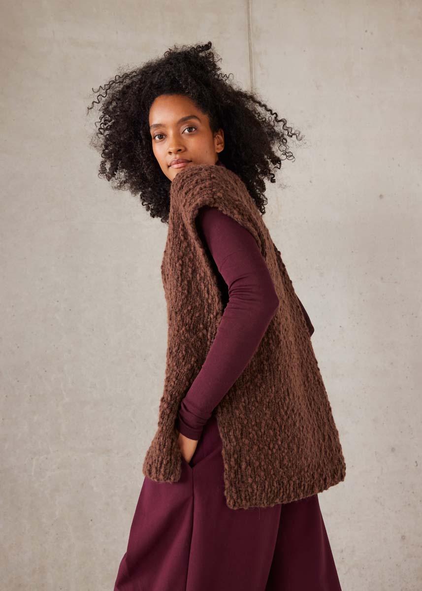 Oversized und großzügig geschlitzt: Der glatt rechts gestrickte SLIPOVER ist ein entspanntes Teil, das auch über weite Blusen passt. Wir lieben seine coole Bouclé-Struktur und den luxuriösen Braunton.