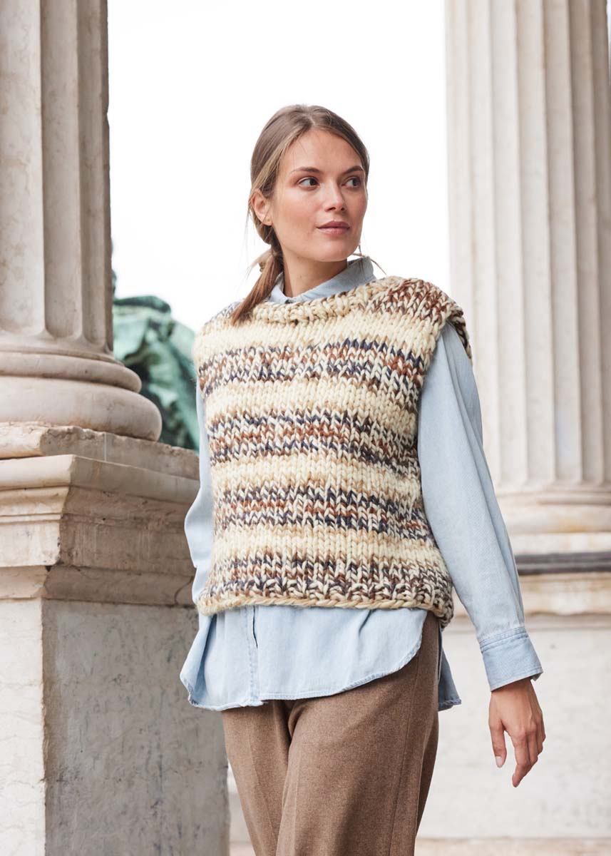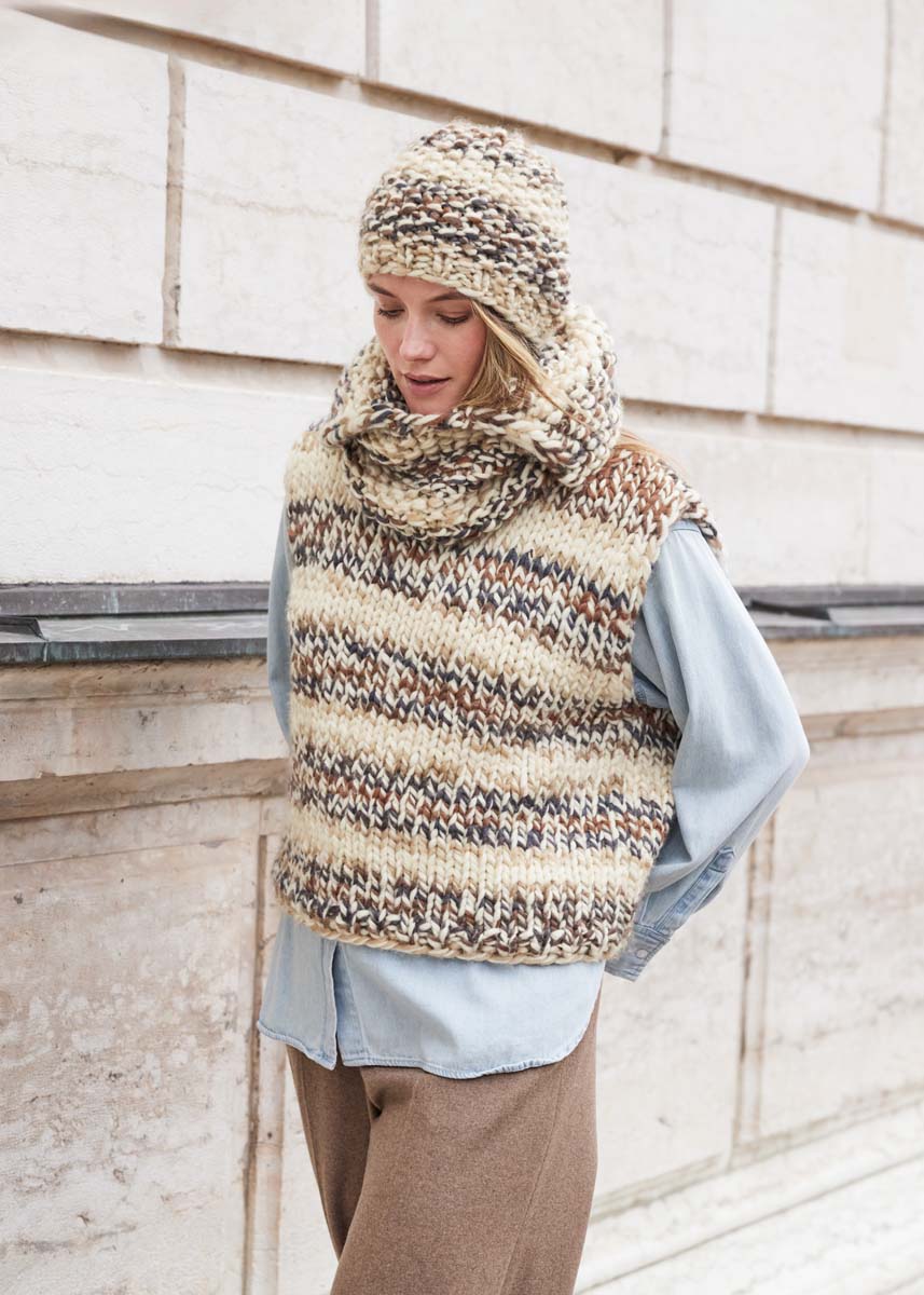 Chunky-Garn Dolce (neu) ist watteweich und, weil locker verzwirnt, ultraleicht. Sein Print zaubert markant melierte Streifen. Durch die daumendicke Qualität kommt man zügig voran – perfekt für angesagte Strick-Sets.