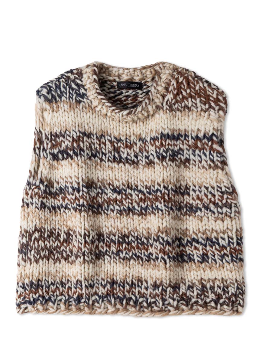 Lana Grossa Dolce (100% Schurwolle (Merino basolan), LL = ca. 50 m/100 g), 500 (600 - 600) g in Rohweiß/Beige/Nougat/Grau (Fb 1); Stricknd Nr. 12 sowie 5 Spielstricknd (Nadelspiel) Nr. 12; eine