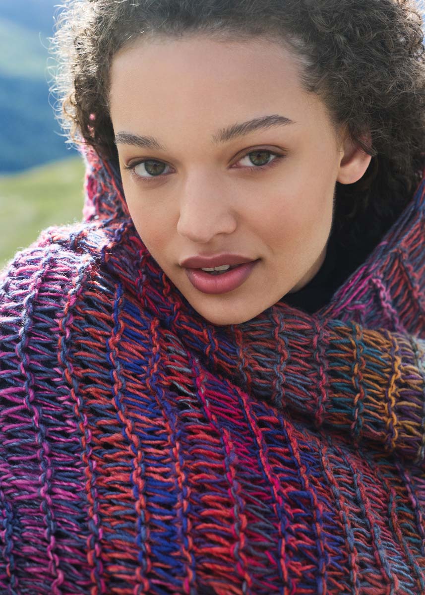 Lana Grossa-Qualität „Gomitolo Intenso“ (50 % Schurwolle, 50 % Polyacryl, LL = ca 700 m/200 g): 1 Knäuel = ca 200 g Dunkelgrau/Dunkel-/Graublau/Petrol/Rosenholz/ Blauviolett/Graugrün (Fb 231) und 1 Knäuel = ca 200 g Pink/Lila/ Ocker-/Goldgelb/Erdbeer/Terrakotta (Fb 238); Stricknadeln Nr 9.