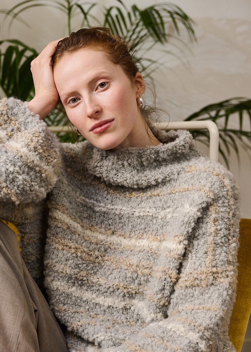 Der gemütliche Streifen-Sweater punktet mit angesagten Bouclé- Noppen und voluminösen Ballonärmeln. Gestrickt wird glatt rechts und in Rippen.
